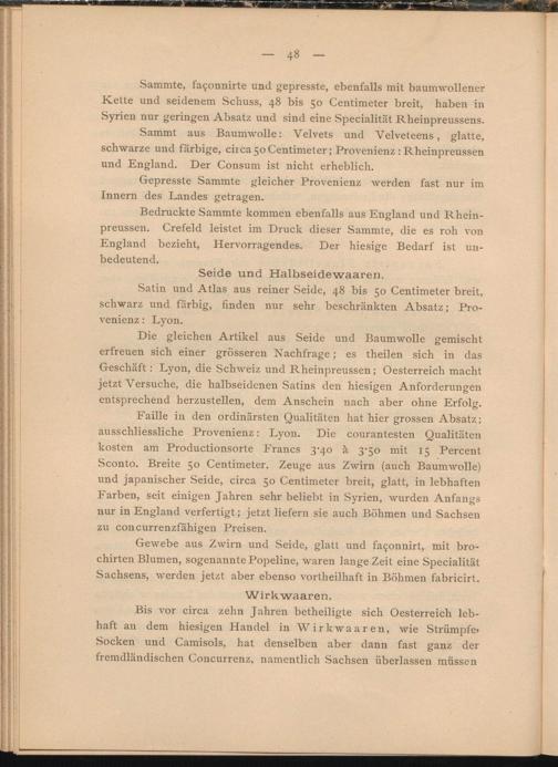 Faille in den ordinärsten Qualitäten hat hier grossen Absatz; ausschliessliche Provenienz: Lyon. Die courantesten Qualitäten kosten am Productionsorte Francs 3*40 ä 3'5o mit 15 Percent Sconto. Breite 50 Centimeter. Zeuge aus Zwirn (auch Baumwolle) und japanischer Seide, circa 50 Centimeter breit, glatt, in lebhaften Farben, seit einigen Jahren sehr beliebt in Syrien, wurden Anfangs nur in England verfertigt; jetzt liefern sie auch Böhmen und Sachsen zu concurrenzfähigen Preisen.