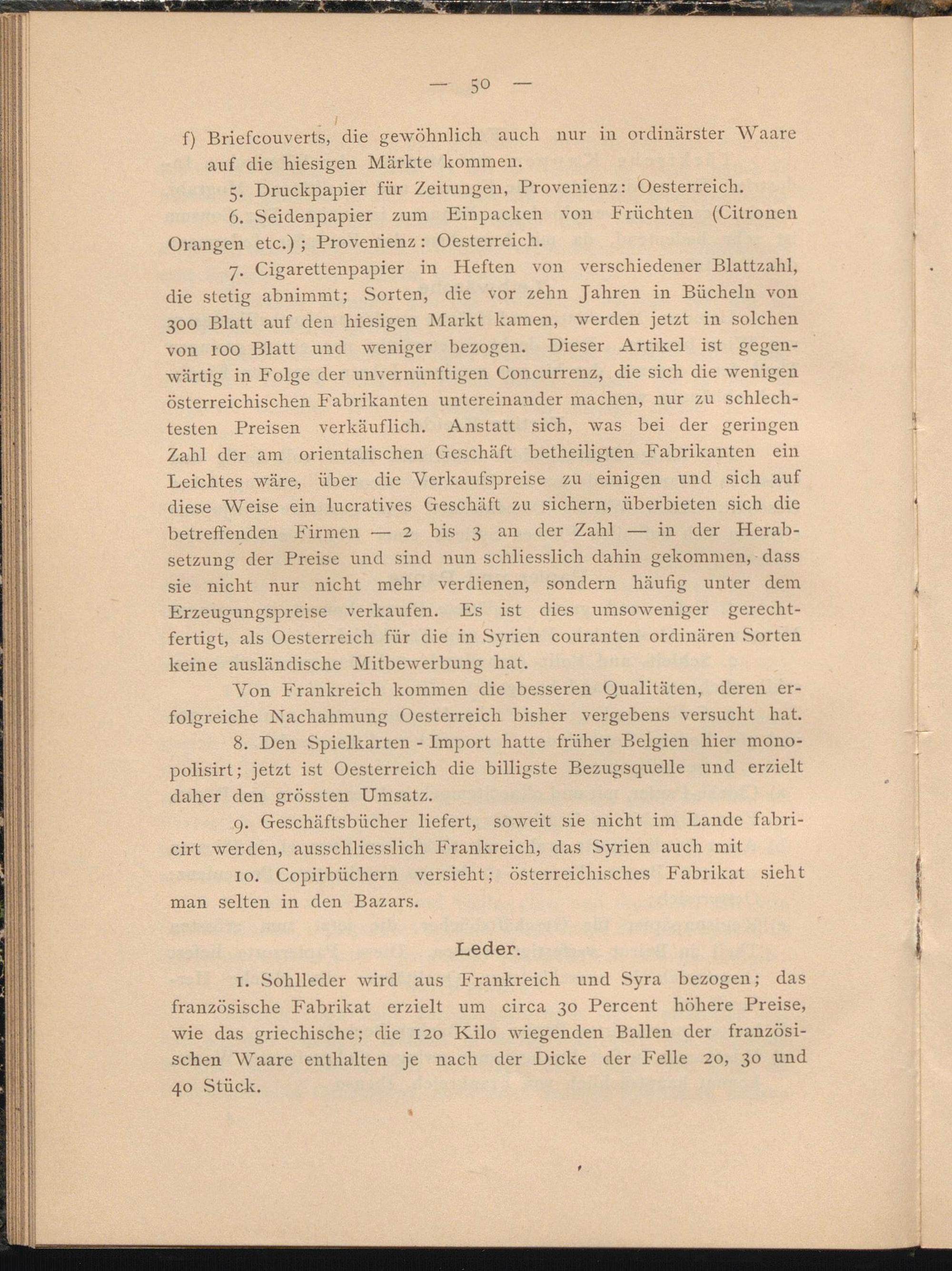 7. Cigarettenpapier in Heften von verschiedener Blattzahl, die stetig abnimmt; Sorten, die vor zehn Jahren in Büchein von 300 Blatt auf den hiesigen Markt kamen, werden jetzt in solchen von too Blatt und weniger bezogen. Dieser Artikel ist gegenwärtig in Folge der unvernünftigen Concurrenz, die sich die wenigen Österreichischen Fabrikanten untereinander machen, nur zu schlechtesten Preisen verkäuflich. Anstatt sich, was bei der geringen Zahl der am orientalischen Geschäft betheiligten Fabrikanten ein Leichtes wäre, über die Verkaufspreise zu einigen und sich auf diese Weise ein lucratives Geschäft zu sichern, überbieten sich die betreffenden Firmen — 2 bis 3 an der Zahl — in der Herabsetzung der Preise und sind nun schliesslich dahin gekommen, dass sie nicht nur nicht mehr verdienen, sondern häufig unter dem Erzeugungspreise verkaufen. Es ist dies umsoweniger gerechtfertigt, als Oesterreich für die in .Syrien couranten ordinären Sorten keine ausländische Mitbewerbung hat.