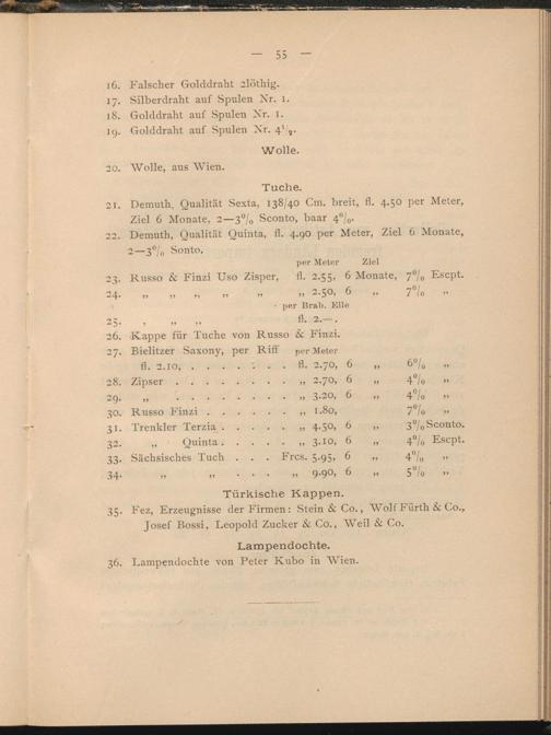 35. Fez, Erzeugnisse der Firmen: Stein & Co., Wolf Fürth & Co., Josef Bossi, Leopold Zucker & Co., Weil & Co.