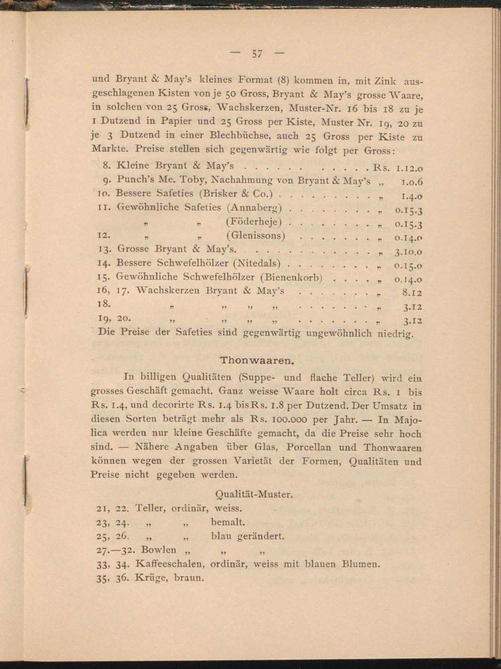 In billigen Qualitäten (Suppe- und flache Teller) wird ein grosses Geschäft gemacht. Ganz weisse Waare holt circa Rs. I bis Rs. 1.4, und decorirte Rs. 1.4 bisRs. 1.8 per Dutzend. Der Umsatz in diesen Sorten beträgt mehr als Rs. 100.000 per Jahr. — In Majo- lica werden nur kleine Geschäfte gemacht, da die Preise sehr hoch sind. — Nähere Angaben über Glas, Porcellan und Thonwaaren können wegen der grossen Varietät der Formen, Qualitäten und Preise nicht gegeben werden.