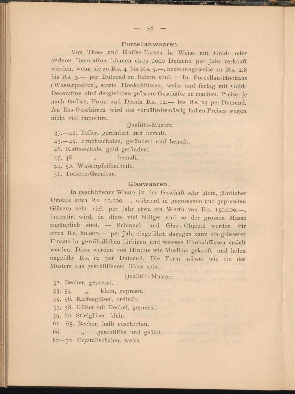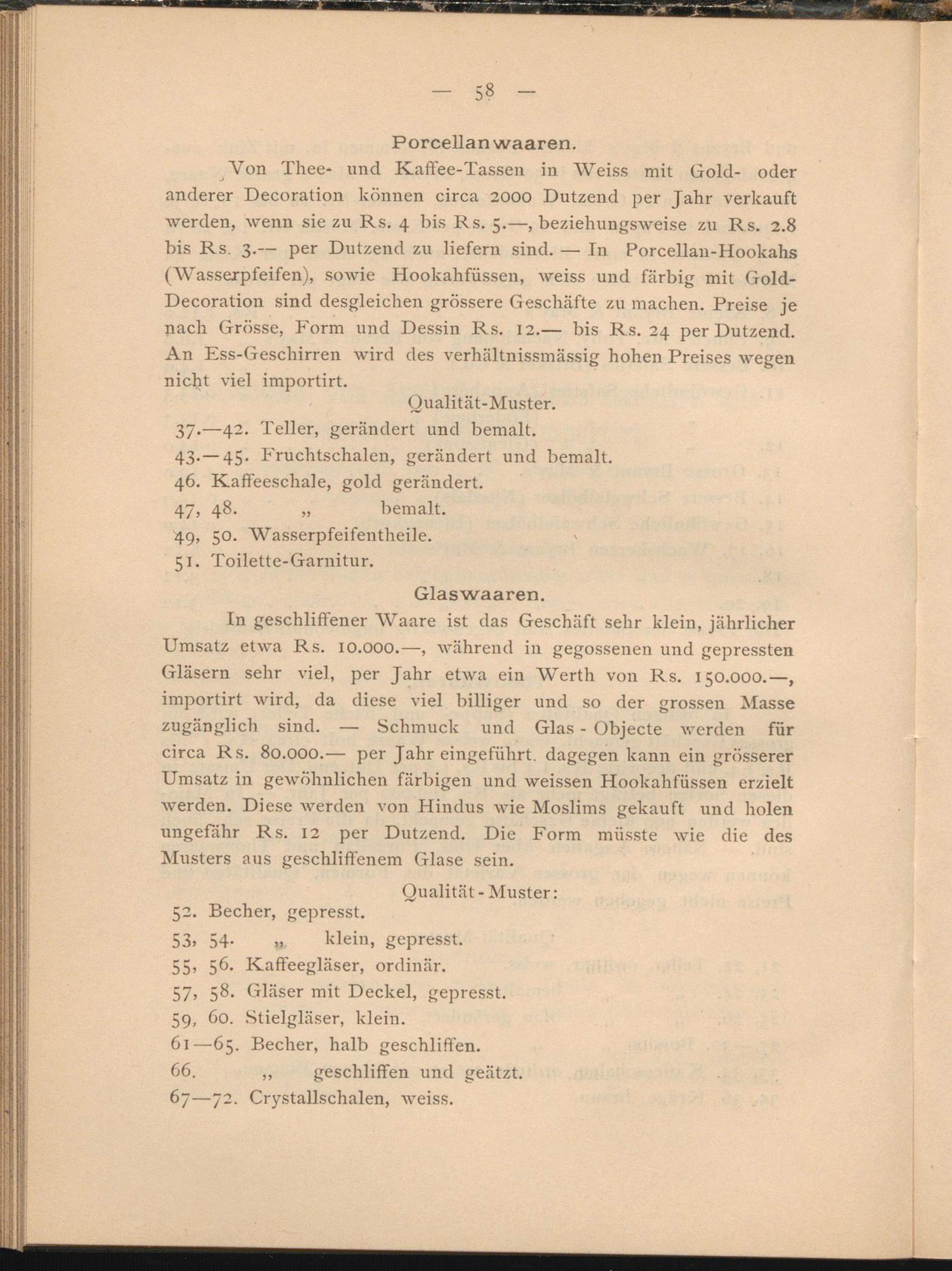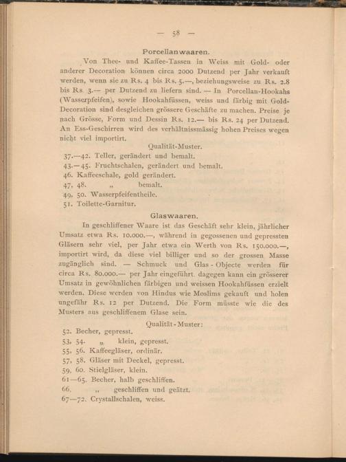 Von Thee- und Kaffee-Tassen in Weiss mit Gold- oder anderer Decoration können circa 2000 Dutzend per Jahr verkauft werden, wenn sie zu Rs. 4 bis Rs. 5.—, beziehungsweise zu Rs. 2.8 bis Rs. 3.— per Dutzend zu liefern sind. — In Porcellan-Hookahs (Wasserpfeifen), sowie Hookahfüssen, weiss und farbig mit Gold- Decoration sind desgleichen grössere Geschäfte zu machen. Preise je nach Grösse, Form und Dessin Rs. 12.— bis Rs. 24 per Dutzend. An Ess-Geschirren wird des verhältnissmassig hohen Preises wegen nicht viel importirt.