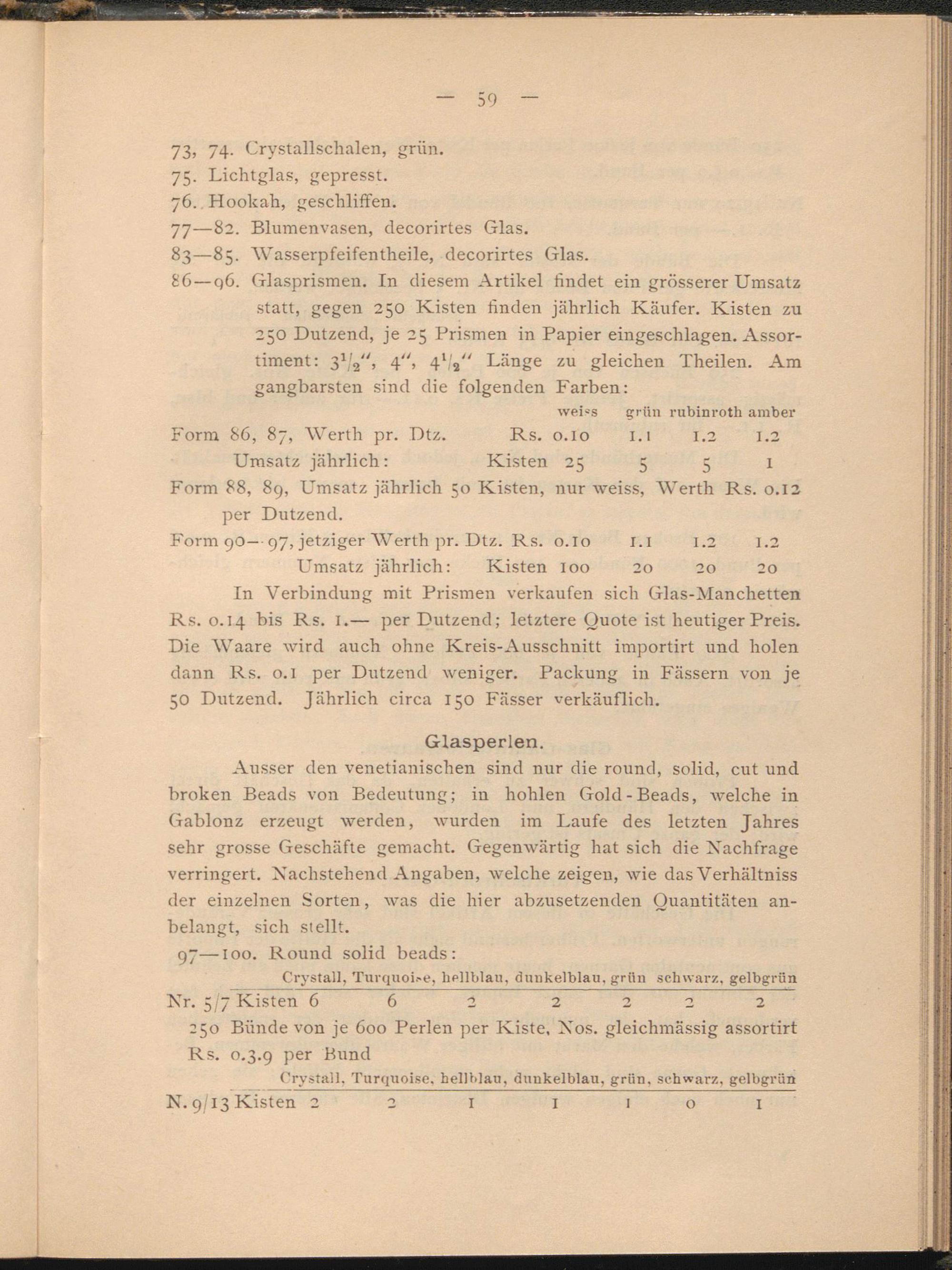 86—q6. Glasprismen. In diesem Artikel findet ein grösserer Umsatz statt, gegen 250 Kisten finden jährlich Käufer. Kisten zu 250 Dutzend, je 25 Prismen in Papier eingeschlagen. Assortiment: 3 l / 2 ", 4", 4 l ' a " Länge zu gleichen Theilen. Am gangbarsten sind die folgenden Farben: