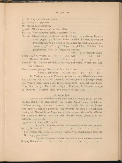 In Verbindung mit Prismen verkaufen sich Glas-Manchetten Rs. 0.14 bis Rs. I.— per Dutzend; letztere Quote ist heutiger Preis. Die Waare wird auch ohne Kreis-Ausschnitt importirt und holen dann Rs. 0.1 per Dutzend weniger. Packung in Fässern von je 50 Dutzend. Jährlich circa 150 Fässer verkäuflich.