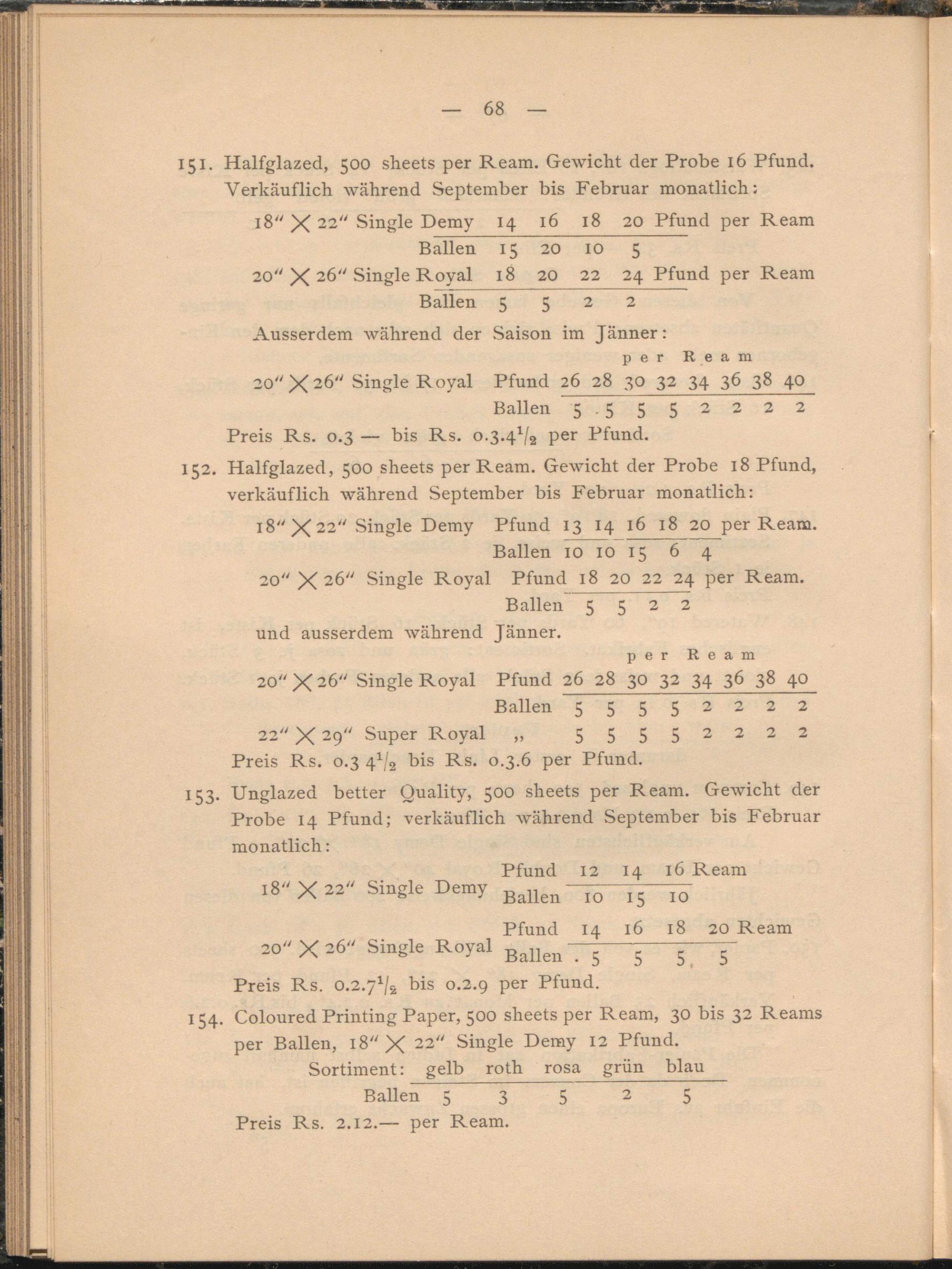 Halfglazed, 500 sheets per Ream. Gewicht der Probe 16 Pfund. Verkäuflich während September bis Februar monatlich: