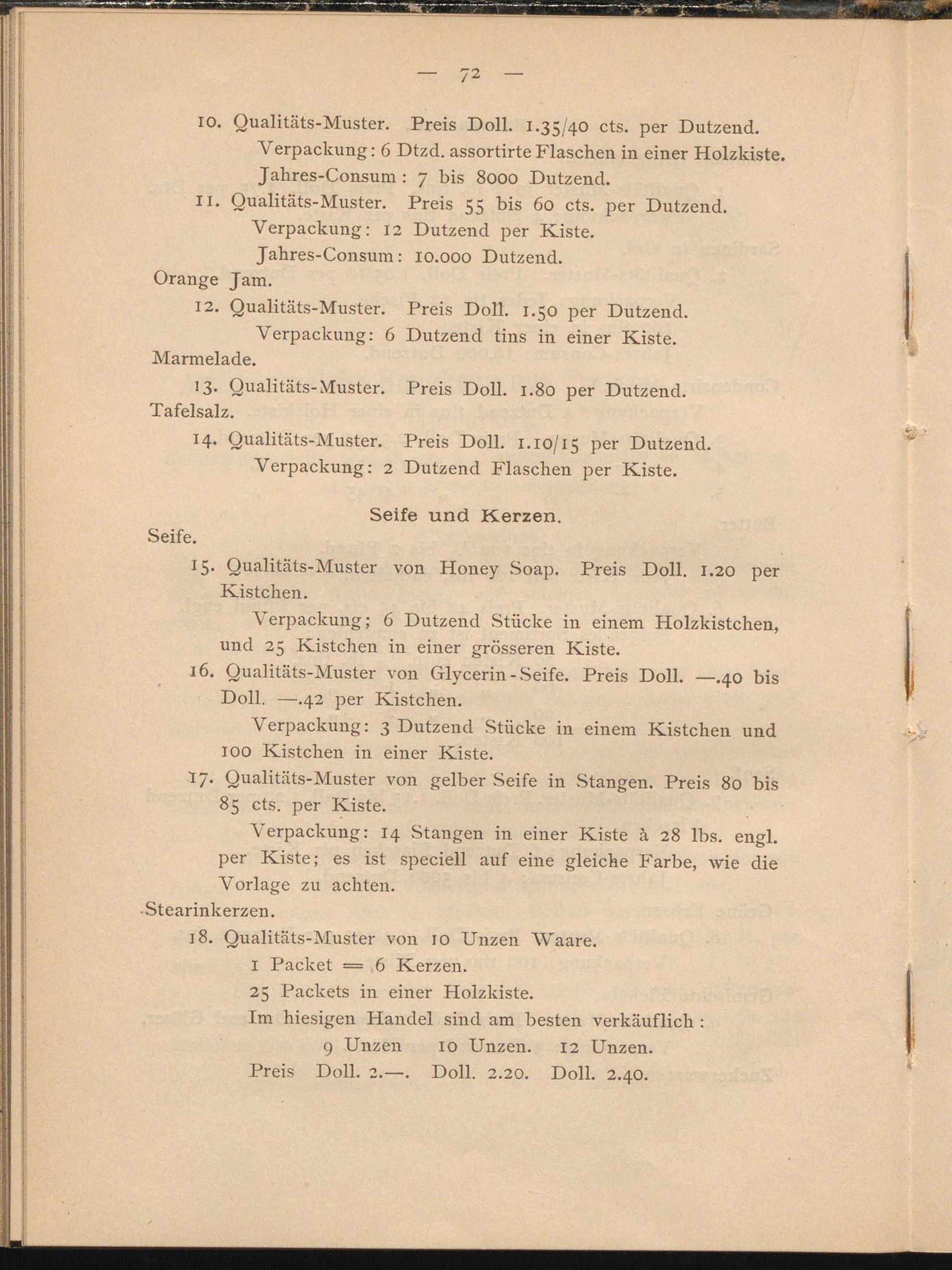 17. Qualitäts-Muster von gelber Seife in Stangen. Preis 80 bis 85 cts. per Kiste.