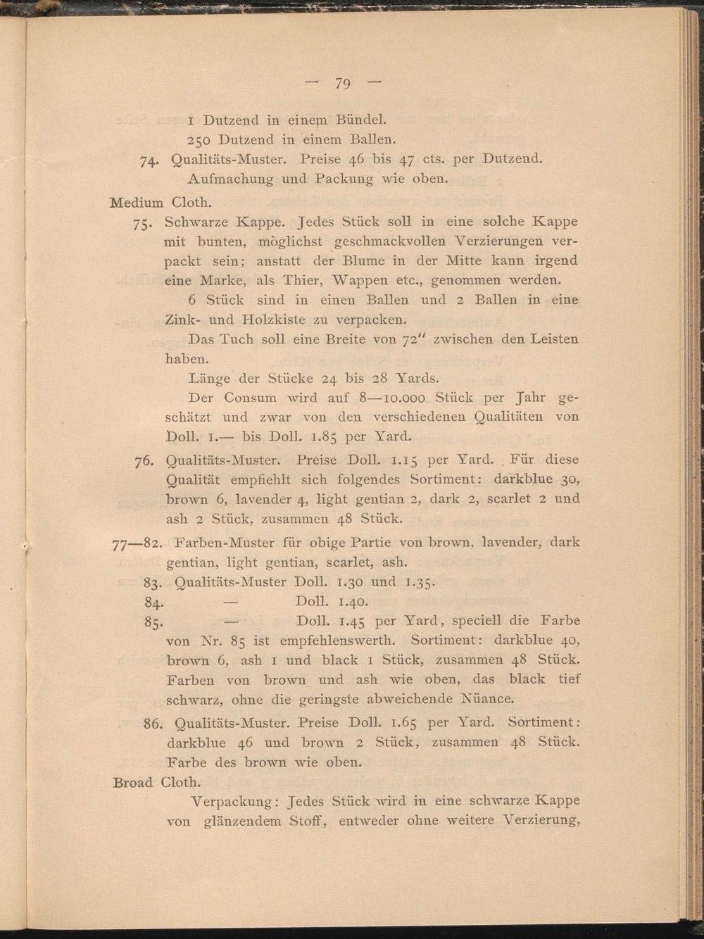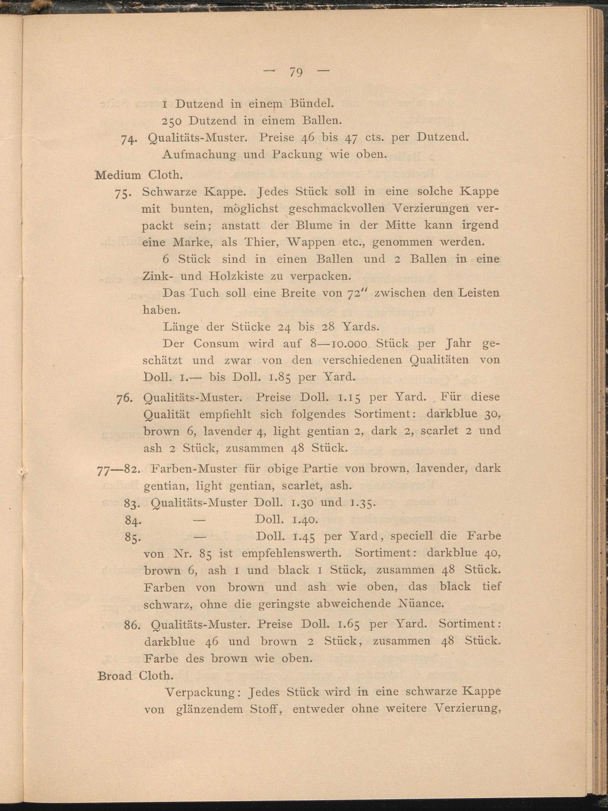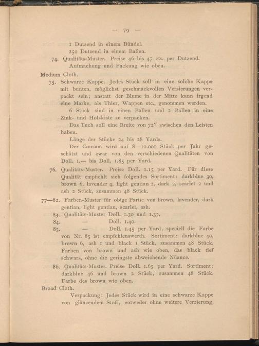 Der Consum wird auf 8—10.000 Stück per Jahr geschätzt und zwar von den verschiedenen Qualitäten von Doll. I.— bis Doll. 1.85 per Yard.