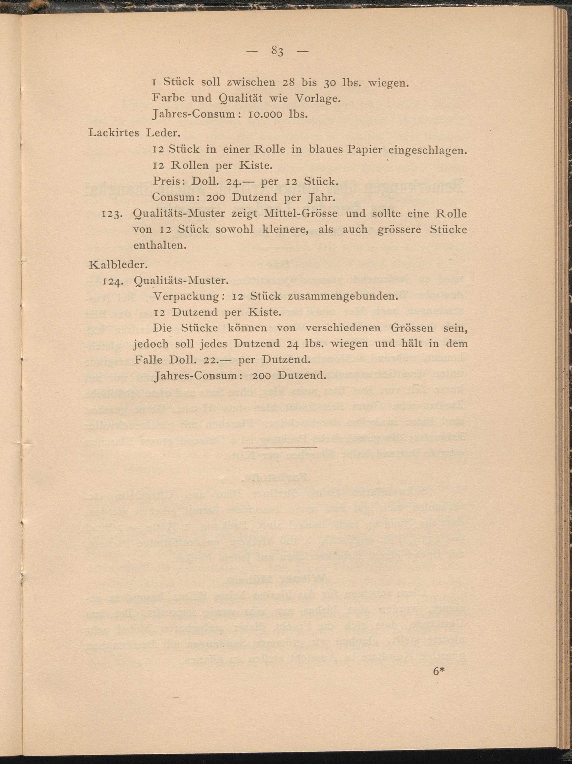 Die Stücke können von verschiedenen Grössen sein, jedoch soll jedes Dutzend 24 lbs. wiegen und hält in dem Falle Doll. 22.— per Dutzend.