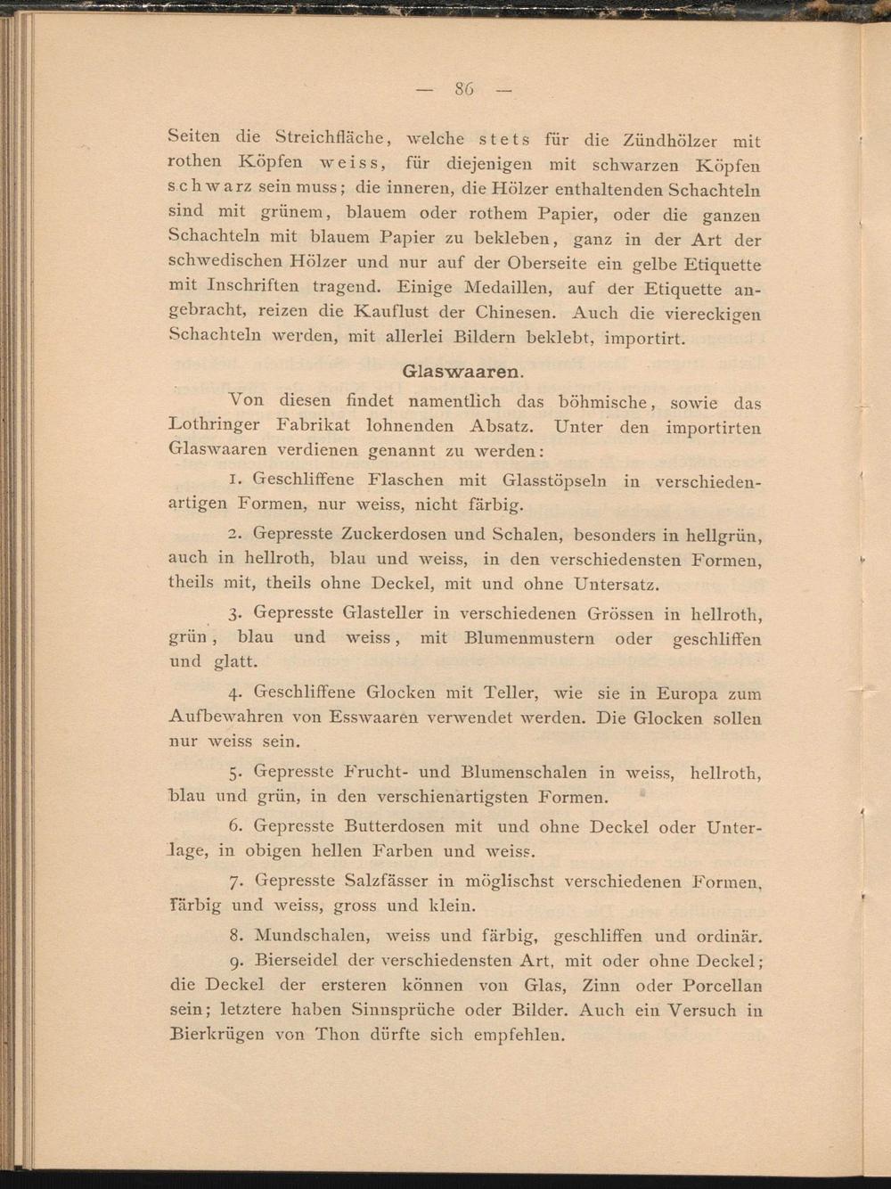 Von diesen findet namentlich das böhmische, sowie das Lothringer Fabrikat lohnenden Absatz. Unter den importirten Glaswaaren verdienen genannt zu werden: