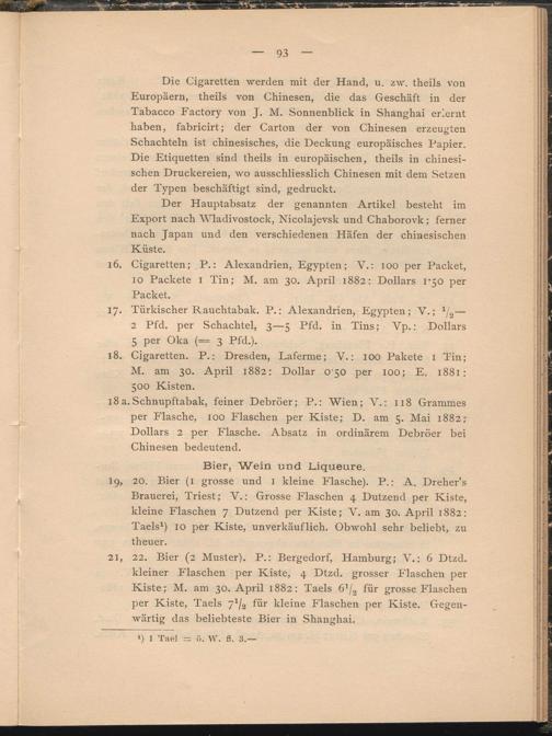 19. 20. Bier (I grosse und 1 kleine Flasche). P.; A. Dreher’s Brauerei, Triest; V.: Grosse Flaschen 4 Dutzend per Kiste, kleine Flaschen 7 Dutzend per Kiste; Y. am 30. April 1882: Taels 1 ) 10 per Kiste, unverkäuflich. Obwohl sehr beliebt, zu theuer.