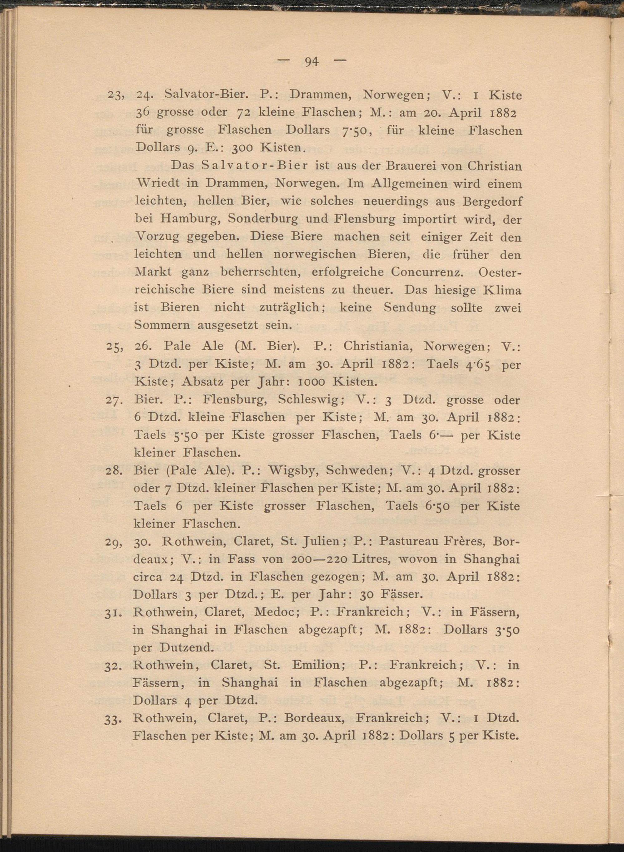 29. 30. Rothwein, Claret, St. Julien; P.: Pastureau Freres, Bordeaux; V.: in Fass von 200—220 Litres, wovon in Shanghai circa 24 Dtzd. in Flaschen gezogen; M. am 30. April 1882: Dollars 3 per Dtzd.; E. per Jahr: 30 Fässer.