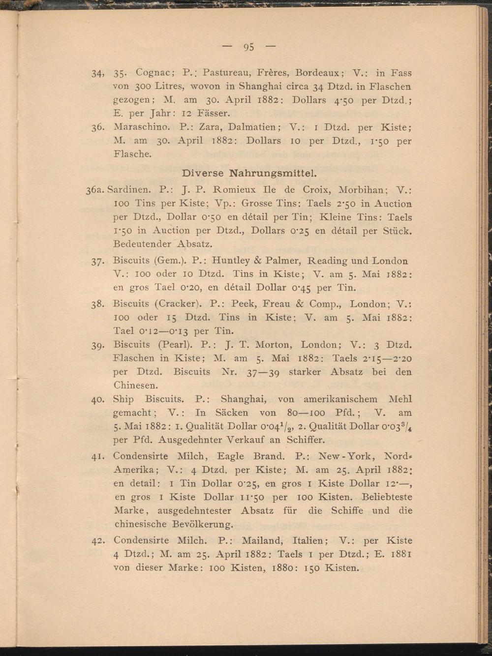 34) 35- Cognac; P.; Pastureau, Frères, Bordeaux; V. : in Fass von 300 Litres, wovon in Shanghai circa 34 Dtzd. in Flaschen gezogen; M. am 30. April 1882: Dollars 4-50 per Dtzd.; E. per Jahr: 12 Fässer.