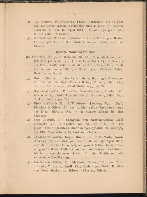 37. Biscuits (Gem.). P. : Huntley & Palmer, Reading und London V.: 100 oder 10 Dtzd. Tins in Kiste; V. am 5. Mai 1882: en gros Tael O'20, en détail Dollar 0'45 per Tin.