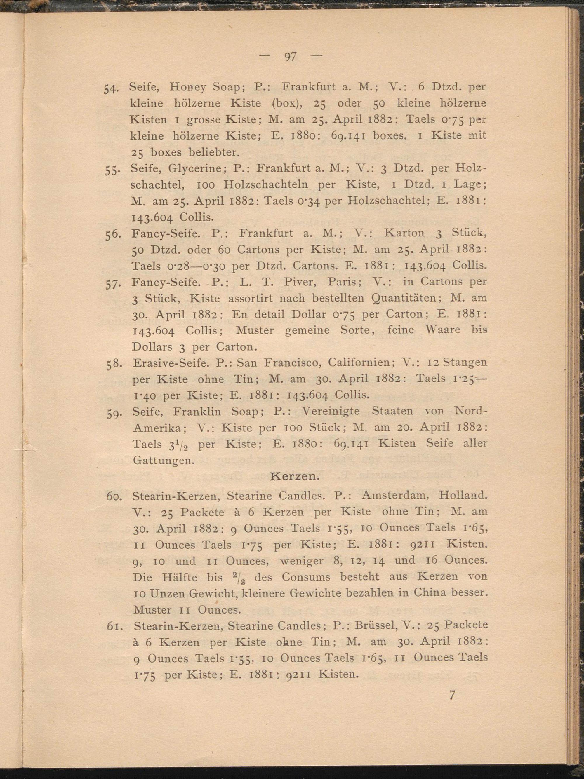 55. Seife, Glycerine; P.: Frankfurt a. M.; V.; 3 Dtzd. per Holz- schachtel, 100 Holzschachteln per Kiste, I Dtzd. 1 Lage; M. am 25. April 1882: Taels 034 per Holzschachtel; E. 1881: 143.604 Collis.