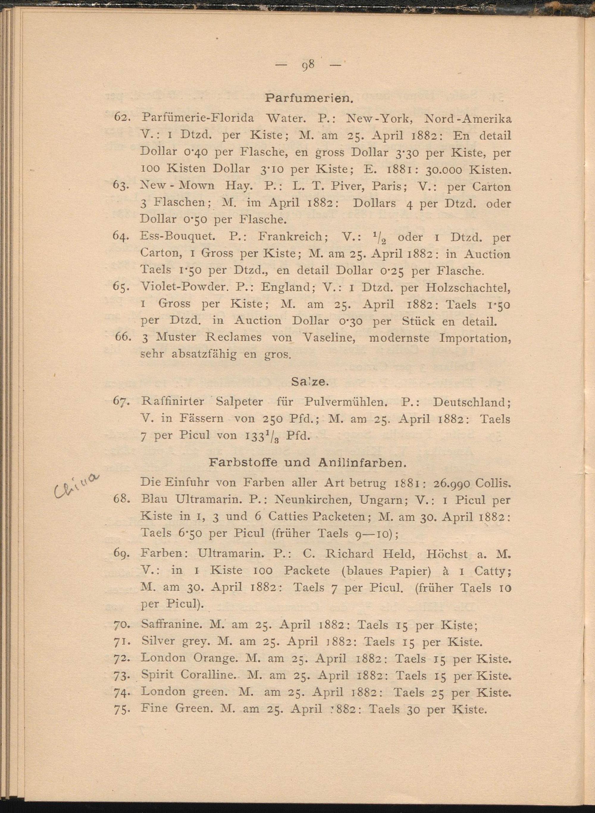 6 g. Farben; Ultramarin. P.: C. Richard Held, Höchst a. M. V.: in 1 Kiste 100 Packete (blaues Papier) ä 1 Catty; M. am 30. April 1882: Taels 7 per Picul, (früher Taels IO per Picul).