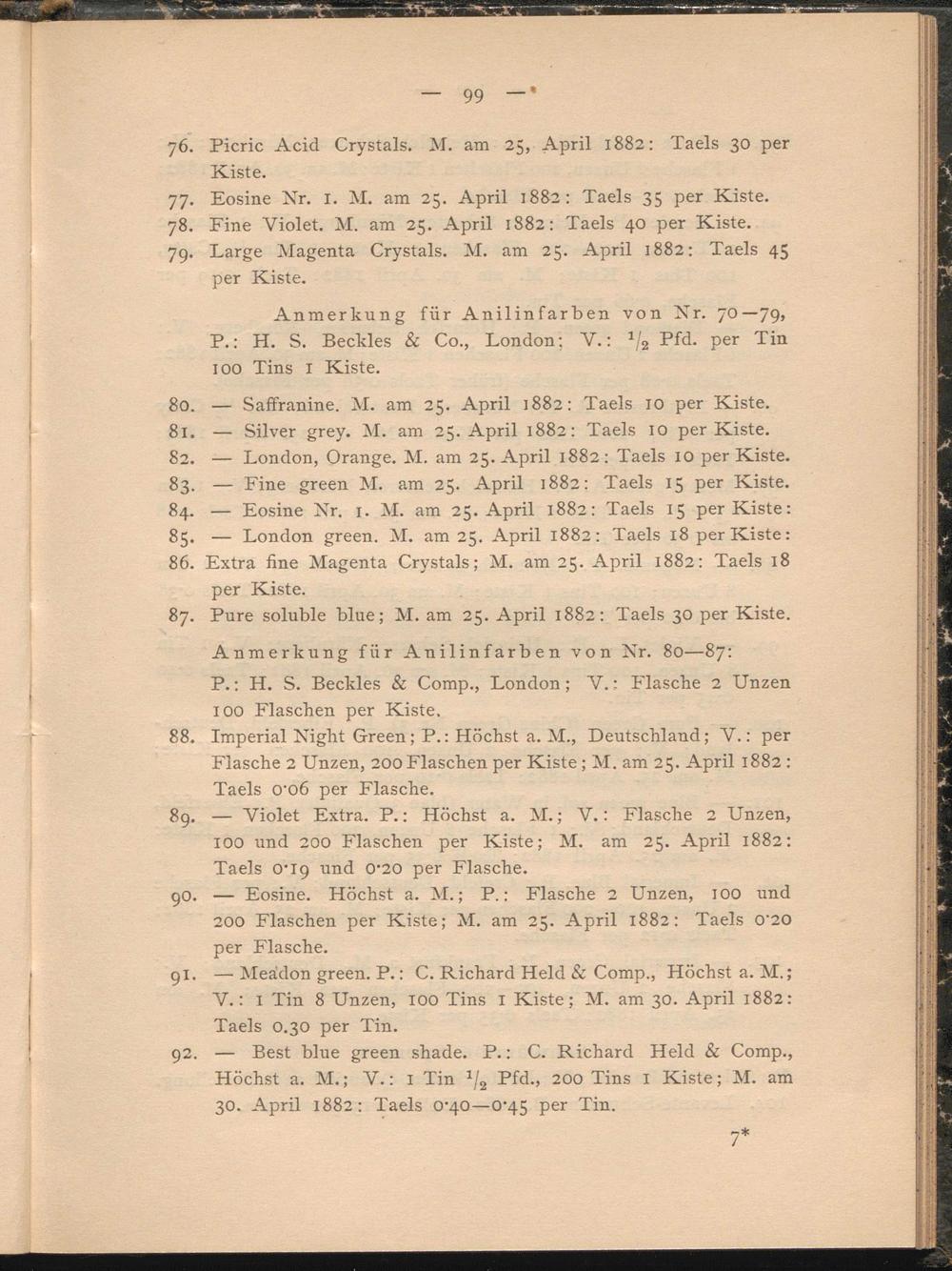 92. — Best blue green shade. P.: C. Richard Held & Comp., Höchst a. M.; V.: 1 Tin 1 / 2 Pfd., 200 Tins 1 Kiste; M. am 30. April 1882: Taels 0-40—0’45 per Tin.