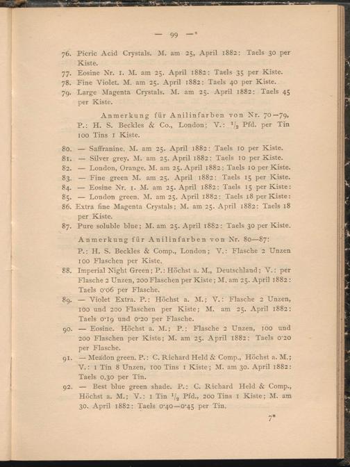 87. Pure soluble blue; M. am 25. April 1882: Taels 30 per Kiste. Anmerkung für Anilinfarben von Nr. 80—87: