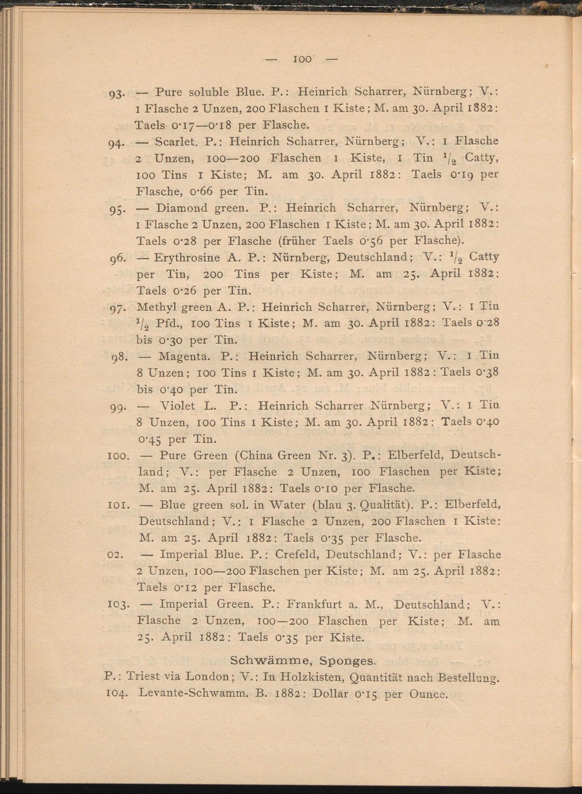 100. — Pure Green (China Green Nr. 3). P.: Elberfeld, Deutschland; V.: per Flasche 2 Unzen, 100 Flaschen per Kiste; M. am 25. April 1882: Taels O’IO per Flasche.