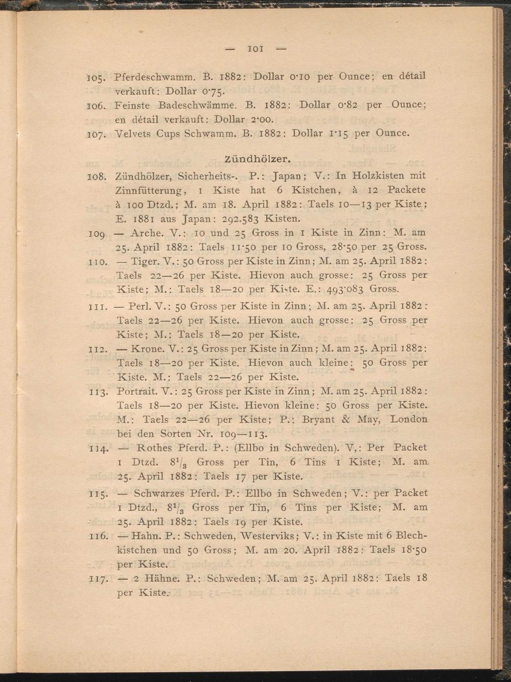 116. —Hahn. P.: Schweden, Westerviks; V.: in Kiste mit 6 Blech- kistchen und 50 Gross; M. am 20. April 1882: Taels i 8"50 per Kiste.