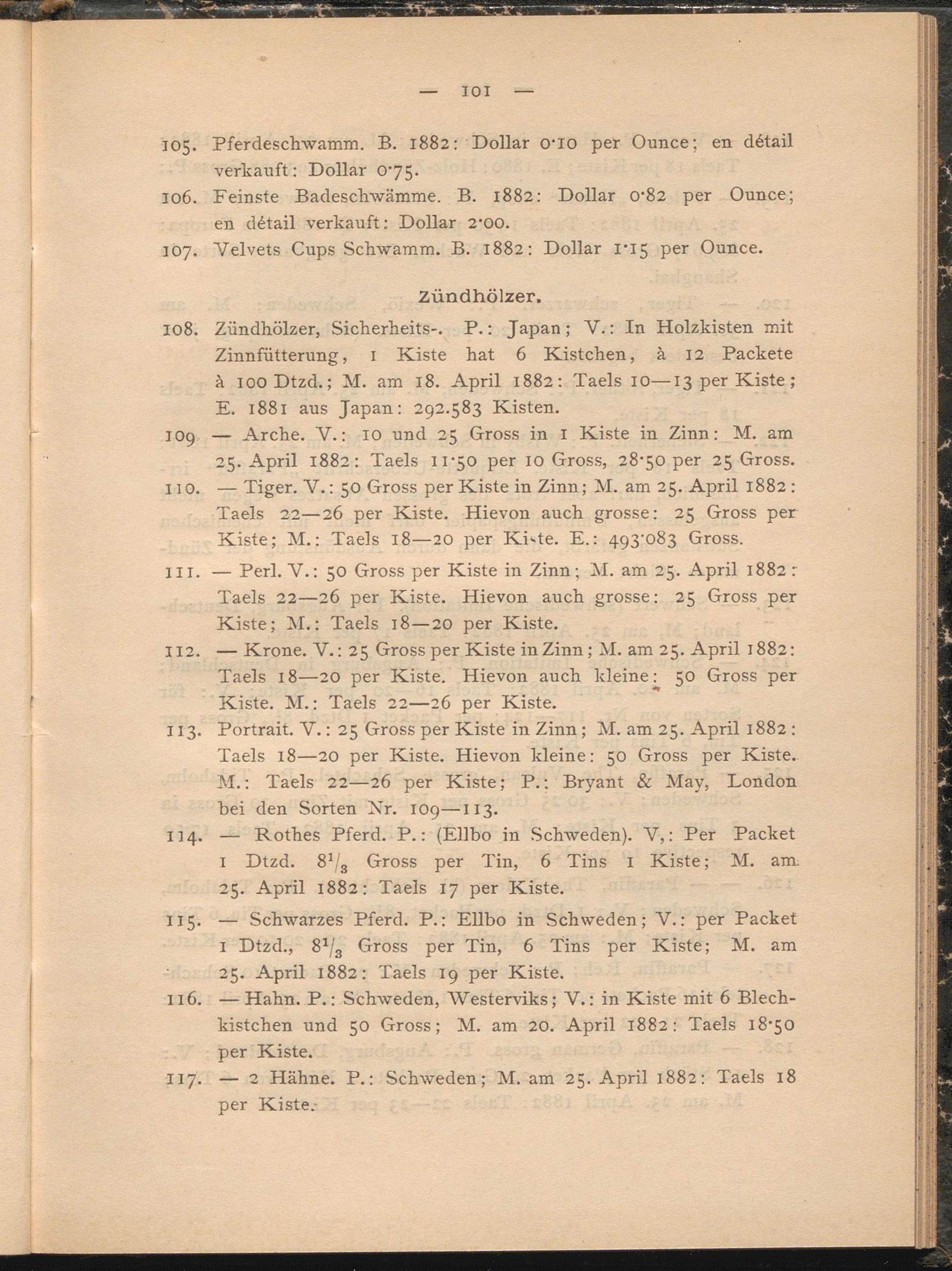 111. — Perl. V.: 50 Gross per Kiste in Zinn; M. am 25. April 1882 : Taels 22—26 per Kiste. Hievon auch grosse: 25 Gross per Kiste; M. : Taels 18—20 per Kiste.