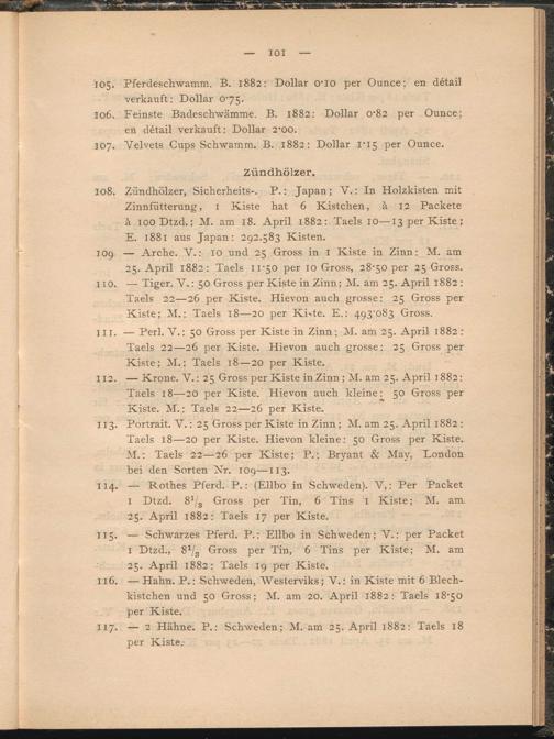 108. Zündhölzer, Sicherheits-. P. : Japan; V.: In Holzkisten mit Zinnfütterung, I Kiste hat 6 Kistchen, à 12 Packete à iooDtzd.; M. am 18. April 1882: Taels IO—13 per Kiste; E. 1881 aus Japan: 292.583 Kisten.