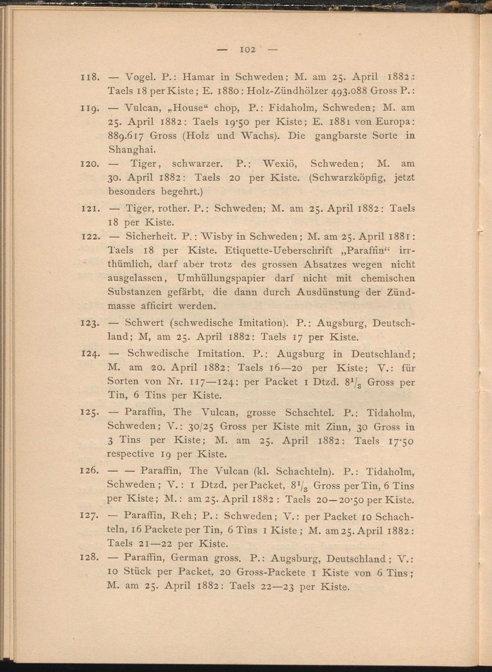 126. — — Paraffin, The Vulcan (kl. Schachteln). P.: Tidaholm, Schweden; V.: 1 Dtzd. per Packet, 8 1 j s Gross per Tin, 6 Tins per Kiste; M.; am 25. April 1882 : Taels 20—20-50 per Kiste.