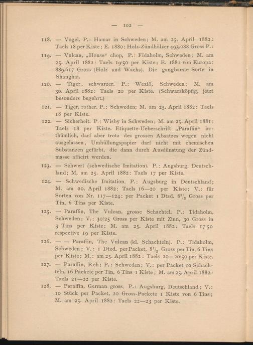 125. — Paraffin, The Vulcan, grosse Schachtel. P.: Tidaholm, Schweden; V.; 30/25 Gross per Kiste mit Zinn, 30 Gross in 3 Tins per Kiste; M. am 25. April 1882: Taels 17-50 respective 19 per Kiste.