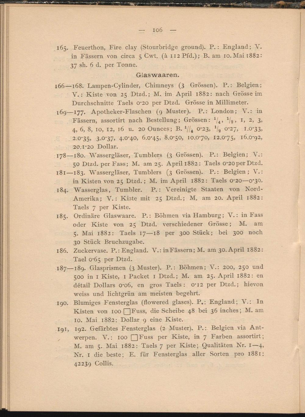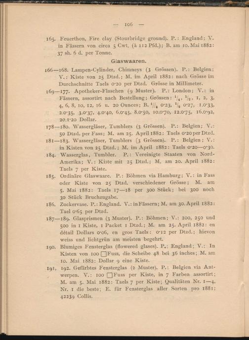 50 Dtzd. per Fass; M. am 25. Aprill882: Taels 0-20 per Dtzd. 181—183. Wassergläser, Tumblers (3 Grössen). P.: Belgien; V.: in Kisten von 25 Dtzd.; M. im April 1882: Taels 0-20—0"3°.