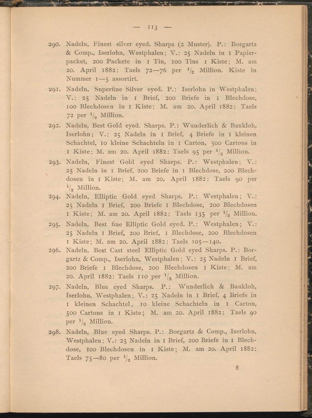 296. Nadeln, Best Cast steel Elliptic Gold eyed Sharps. P.: Borgartz & Comp., Iserlohn, Westphalen; V.: 25 Nadeln I Brief, 200 Briefe 1 Blechdose, 200 Blechdosen 1 Kiste ; M. am 20. April 1882: Taels no per 1 / a Million.