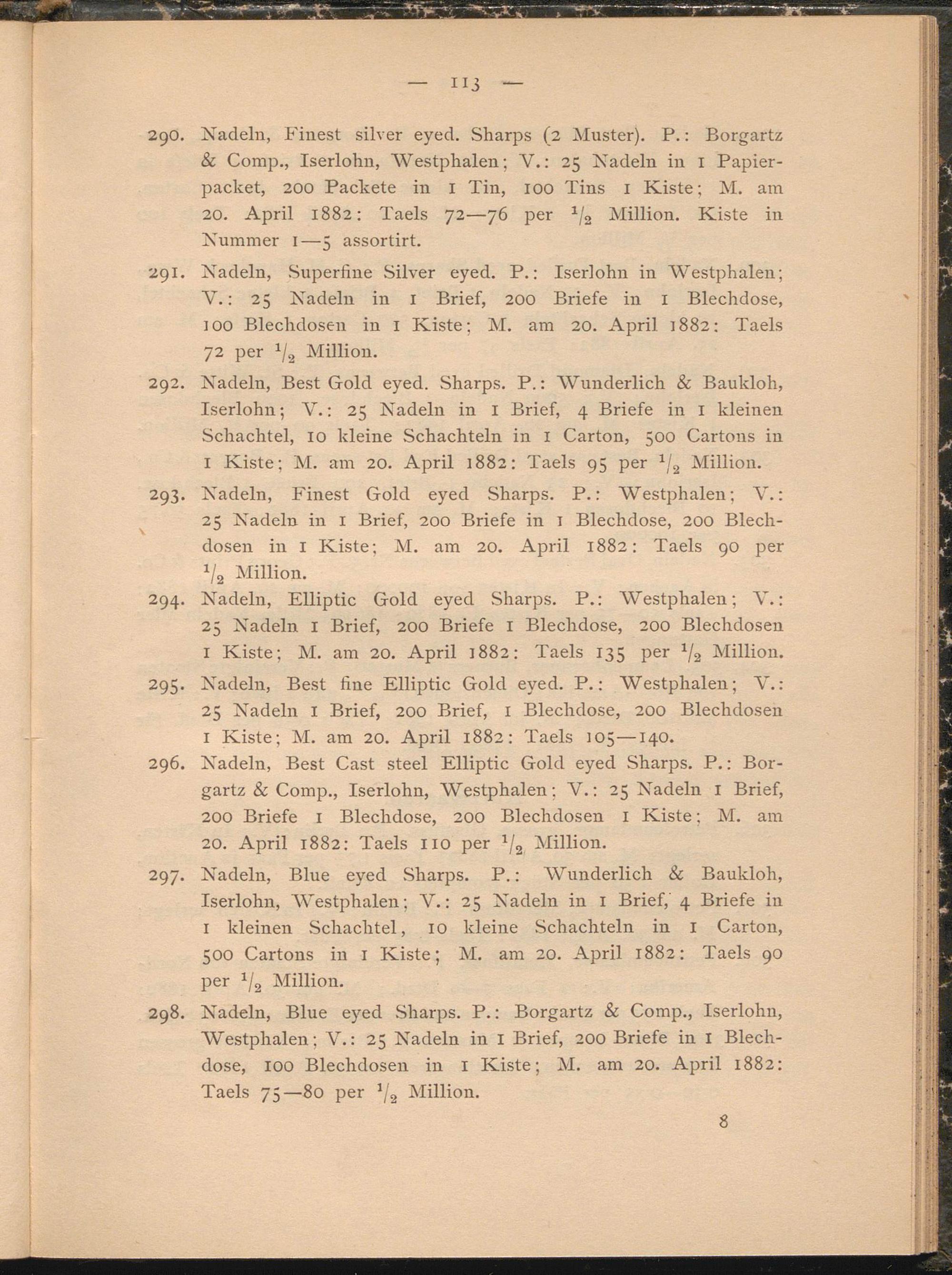Iserlohn, Westphalen; V.: 25 Nadeln in 1 Brief,' 4 Briefe in 1 kleinen Schachtel, 10 kleine Schachteln in I Carton, 500 Cartons in 1 Kiste; M. am 20. April 1882: Taels 90 per 1 / 2 Million.