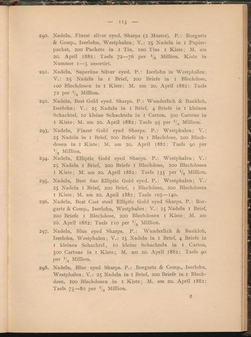 298. Nadeln, Blue eyed Sharps. P.: Borgartz & Comp., Iserlohn, Westphalen; V.: 25 Nadeln in I Brief, 200 Briefe in I Blechdose, 100 Blechdosen in I Kiste; M. am 20. April 1882: Taels 75—80 per J / 2 Million.