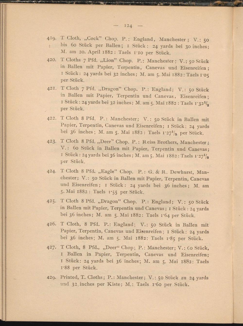 425. T Cloth 8 Pfd. „Dragon” Chop. P.: England; V.: 50 Stück in Ballen mit Papier, Terpentin und Canevas; I Stück : 24 yards bei 36 inches; M. am 5. Mai 1882: Taels r64 per Stück.