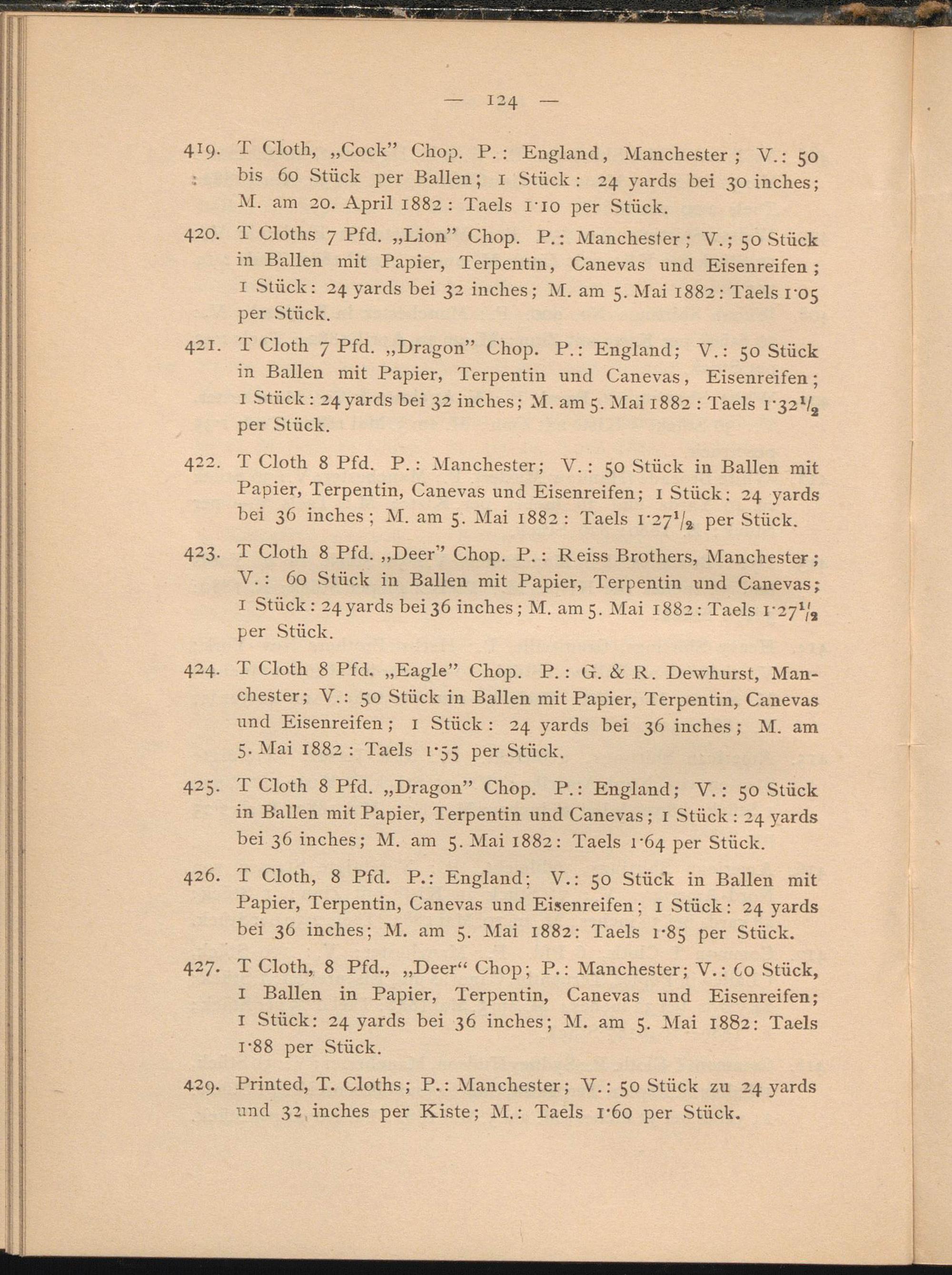 426. T Cloth, 8 Pfd. P.: England: V.: 50 Stück in Ballen mit Papier, Terpentin, Canevas und Eisenreifen; I Stück: 24 yards bei 36 inches; M. am 5. Mai 1882: Taels 1-85 per Stück.