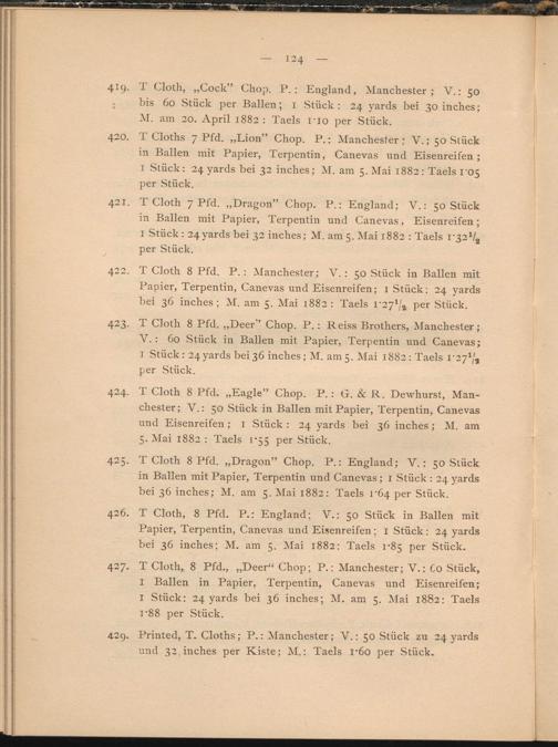 423. T Cloth 8 Pfd. „Deer” Chop. P.: Reiss Brothers, Manchester; V. : Go Stück in Ballen mit Papier, Terpentin und Canevas; I Stück: 24 yards bei 36 inches ; M. am 5. Mai 1882: Taels l' 2 y l h per Stück.