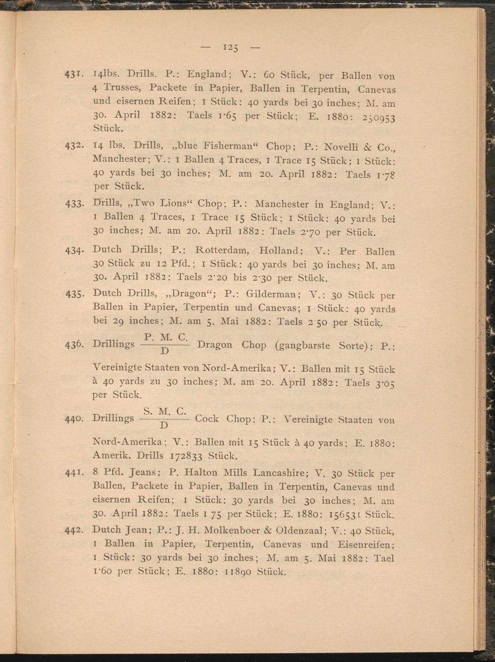 431. r4lbs. Drills. P.: England; V.: 60 Stück, per Ballen von 4 Trusses, Packete in Papier, Ballen in Terpentin, Canevas und eisernen Reifen; I Stück: 40 yards bei 30 inches; M. am 30. April 1882: Taels 1-65 per Stück; E. 1880: 250953 Stück.