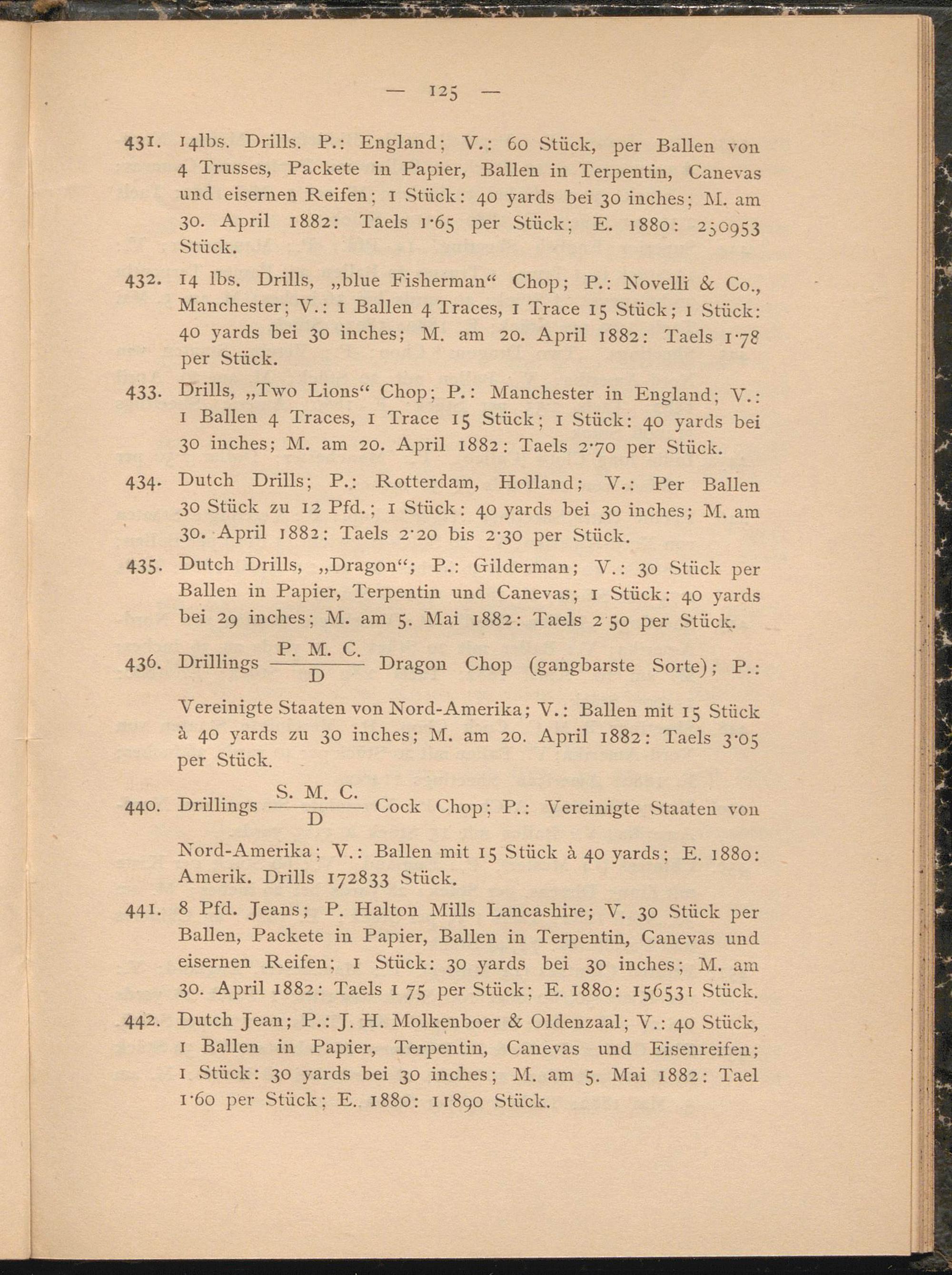 434. Dutch Drills; P.: Rotterdam, Holland; V.: Per Ballen 30 Stück zu 12 Pfd.; I Stück: 40 yards bei 30 inches; M. am 30. April 1882: Taels 2’20 bis 230 per Stück.
