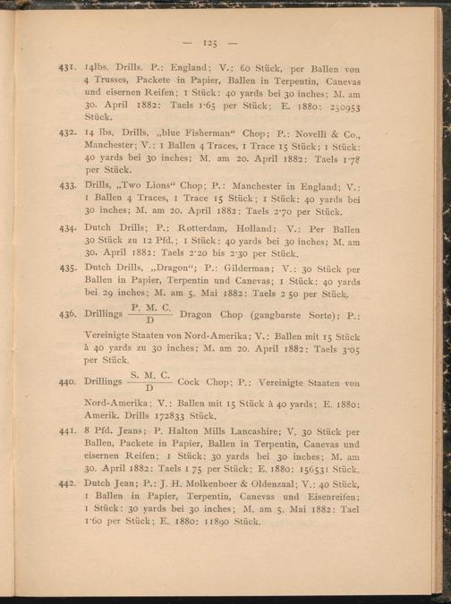 442. Dutch Jean; P.: J. H. Molkenboer & Oldenzaal; V.: 40 Stück, 1 Ballen in Papier, Terpentin, Canevas und Eisenreifen; I Stück: 30 yards bei 30 inches; M. am 5. Mai 1882: Tael r6o per Stück; E. 1880: 11890 Stück.