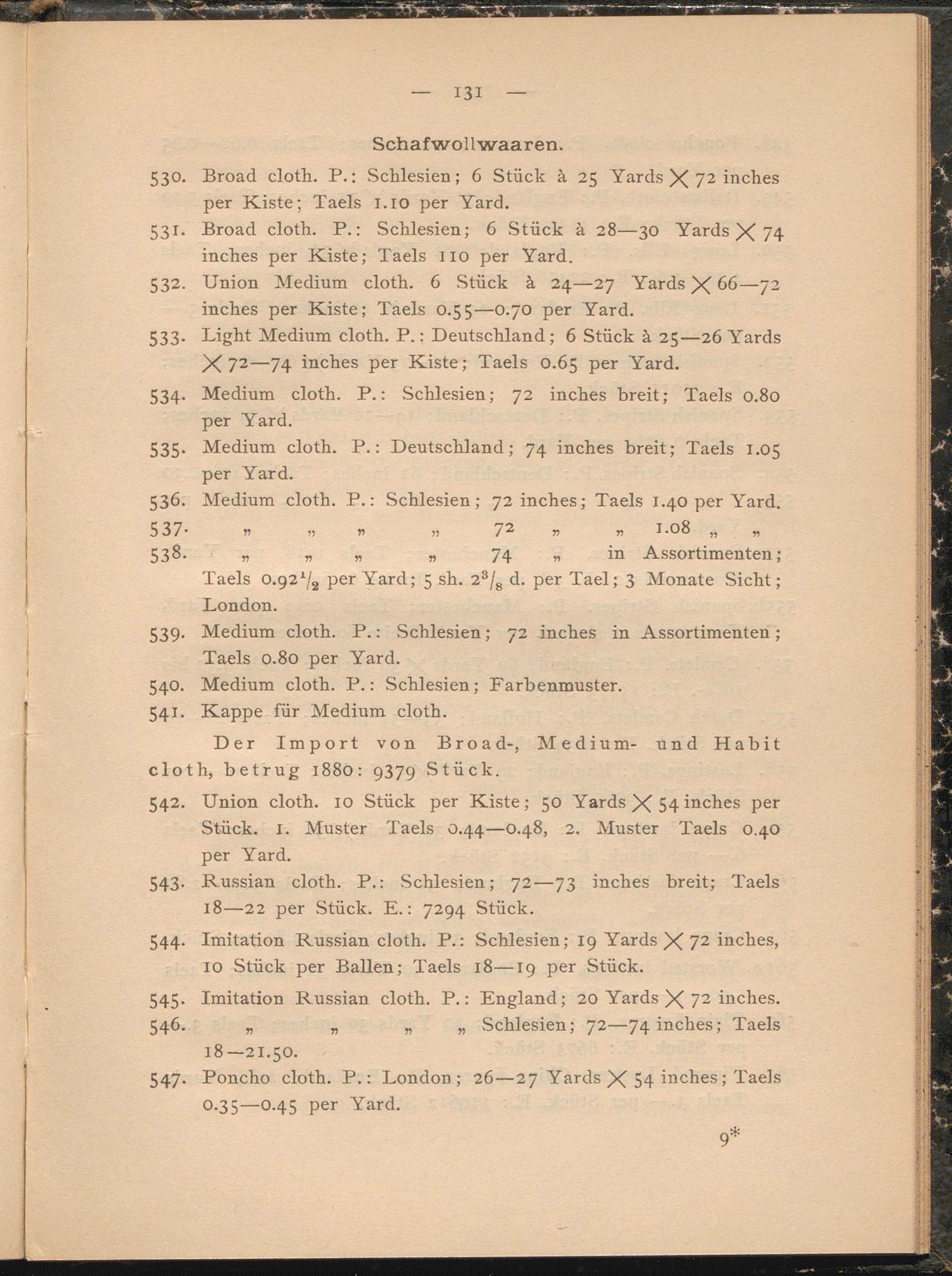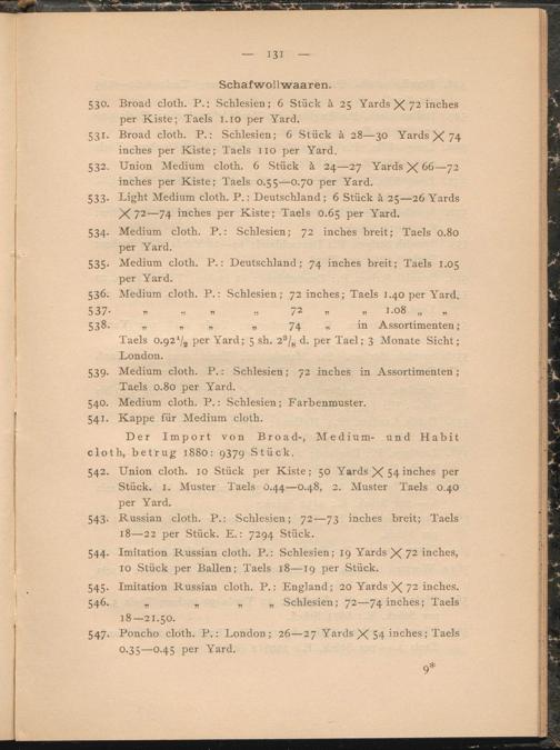531. Broad cloth. P.: Schlesien; 6 Stück ä 28—30 Yards X 74 inches per Kiste; Taels no per Yard.