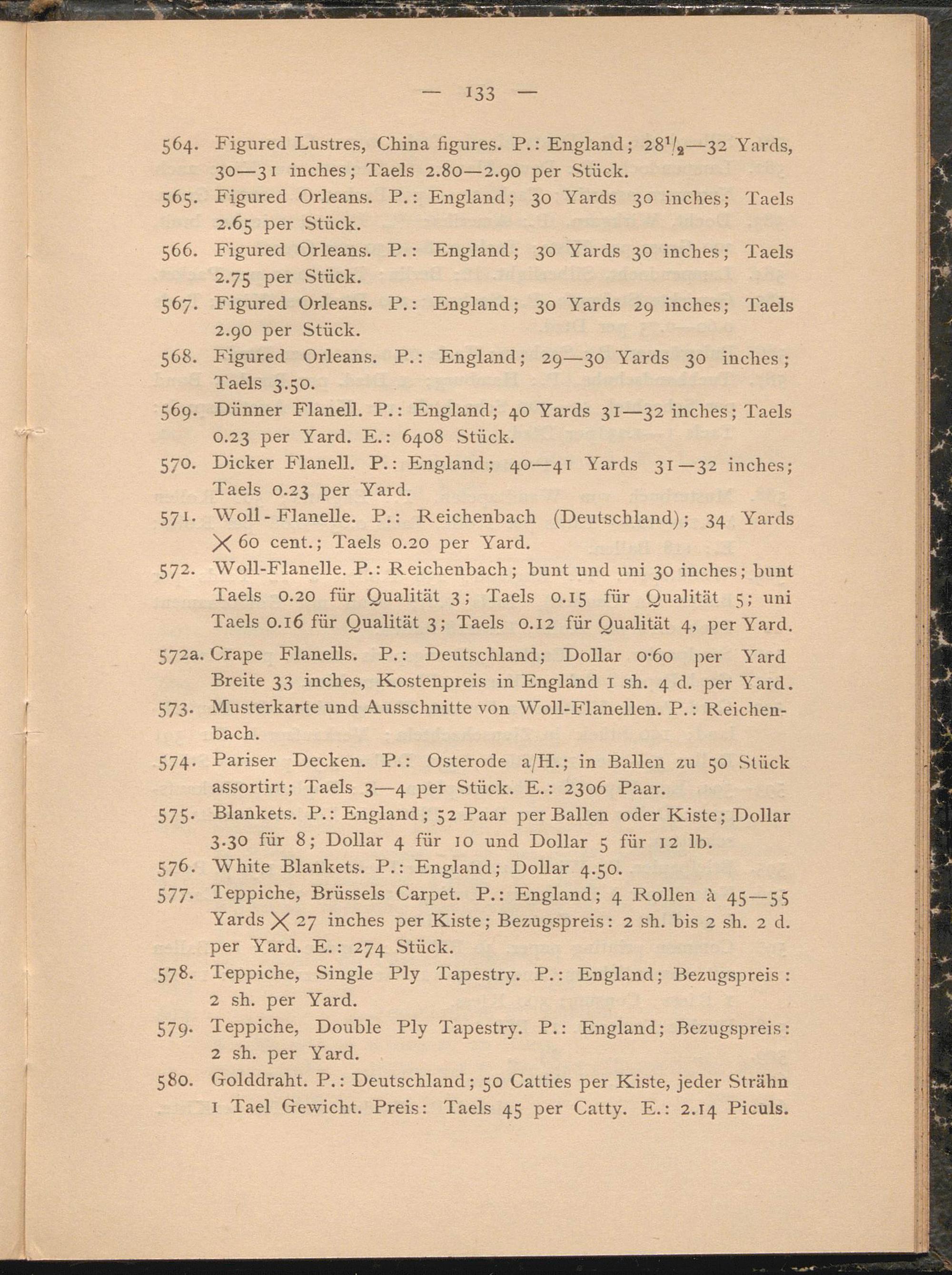564. Figured Lustres, China figures. P.: England; 28V S —32 Yards, 30—31 inches; Taels 2.80—2.90 per Stück.