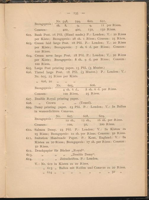 Bank Post. 16 Pfd. (Hand made.) P.: London; V.: 20 Riess per Kiste; Bezugspreis: 28 sh. I Riess; Consum: 25 Riess. Cream laid large Post. 18 Pfd. P.: London; V.; 20 Riess per Kiste; Bezugspreis: 7 sh. 6 d. per Riess; Consum: