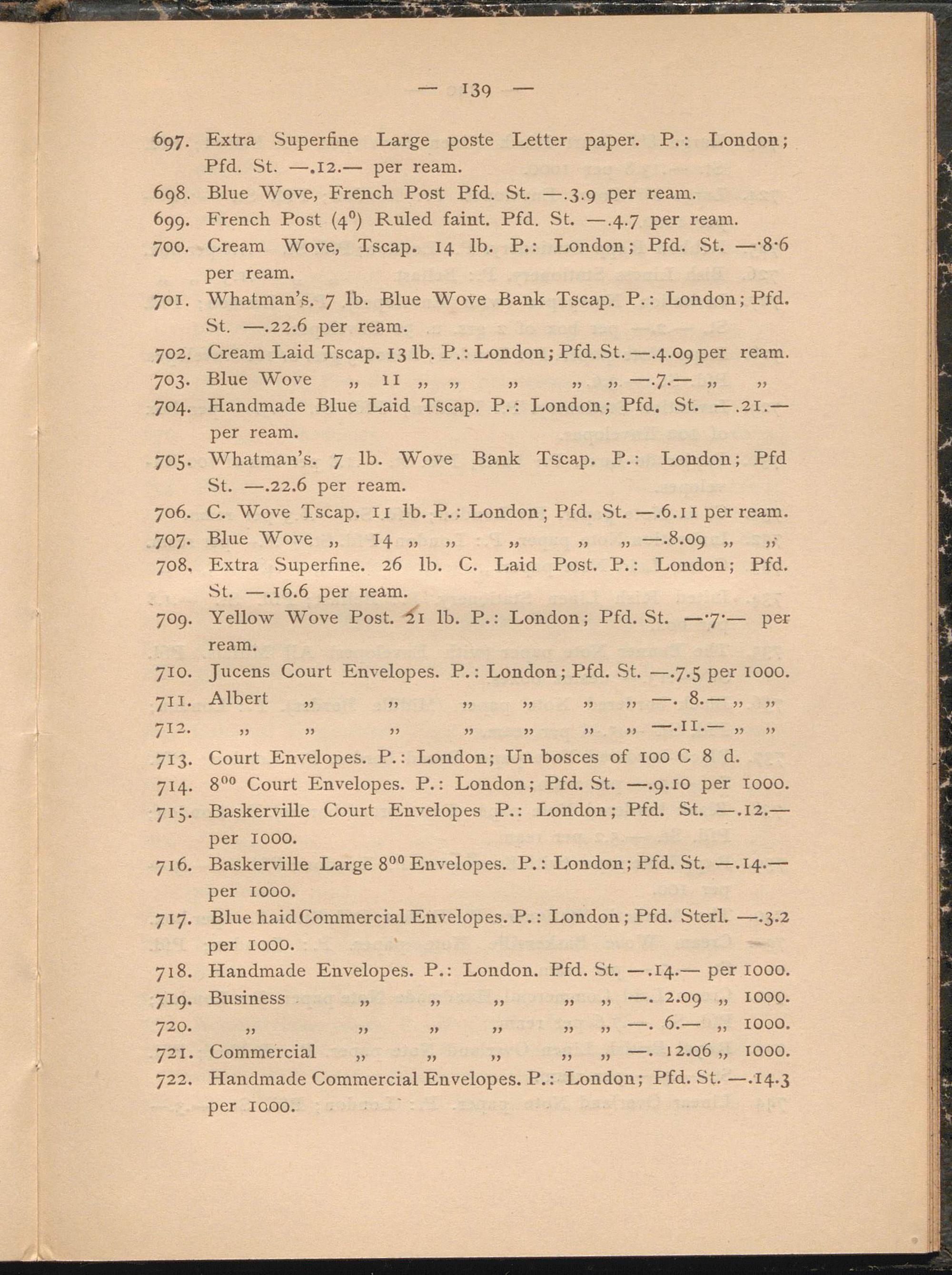 700. Cream Wove, Xscap. 14 lb. P.: London; Pfd. St. —’8-6 per ream.