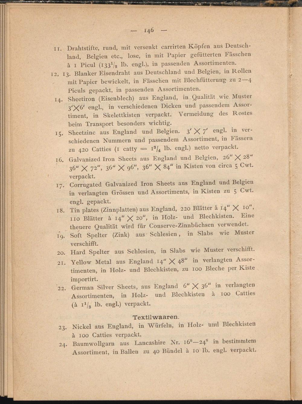 II. Drahtstifte, rund, mit versenkt carrirten Köpfen aus Deutschland, Belgien etc., lose, in mit Papier gefütterten Fässchen ä 1 Picul (r33 1 / 2 lb. engl.), in passenden Assortimenten.
