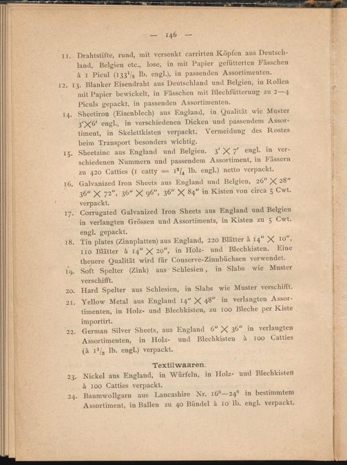 22. German Silver Sheets, aus England 6" X 3b" hi verlangten Assortimenten, in Holz- und Blechkisten ä 100 Catties (ä i'/g lb. engl.) verpackt.