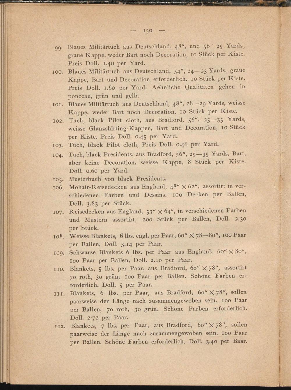 111. Blankets, 6 Ibs. per Paar, aus Bradford, 60" X 78", sollen paarweise der Länge nach zusammengewoben sein. 100 Paar per Ballen, 70 roth, 30 grün. Schöne Farben erforderlich. Doll. 272 per Paar.