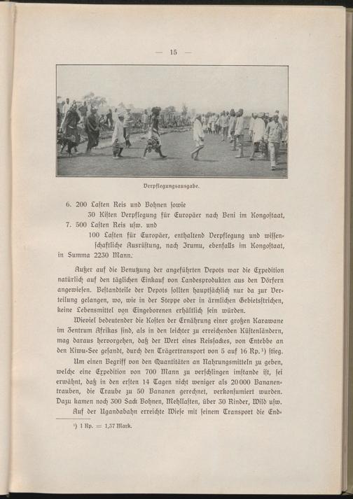 Um einen Begriff von den (huantitäten an Nahrungsmitteln zu geben, welche eine Expedition von 700 Mann zu verschlingen imstande ist, sei erwähnt, daß in den ersten 14 Tagen nicht weniger als 20000 Bananen- trauben, die Traube zu 50 Bananen gerechnet, verkonsumiert wurden. Dazu kamen noch 300 Back Bohnen, Mehllasten, über 30 Kinder, Wild usw.