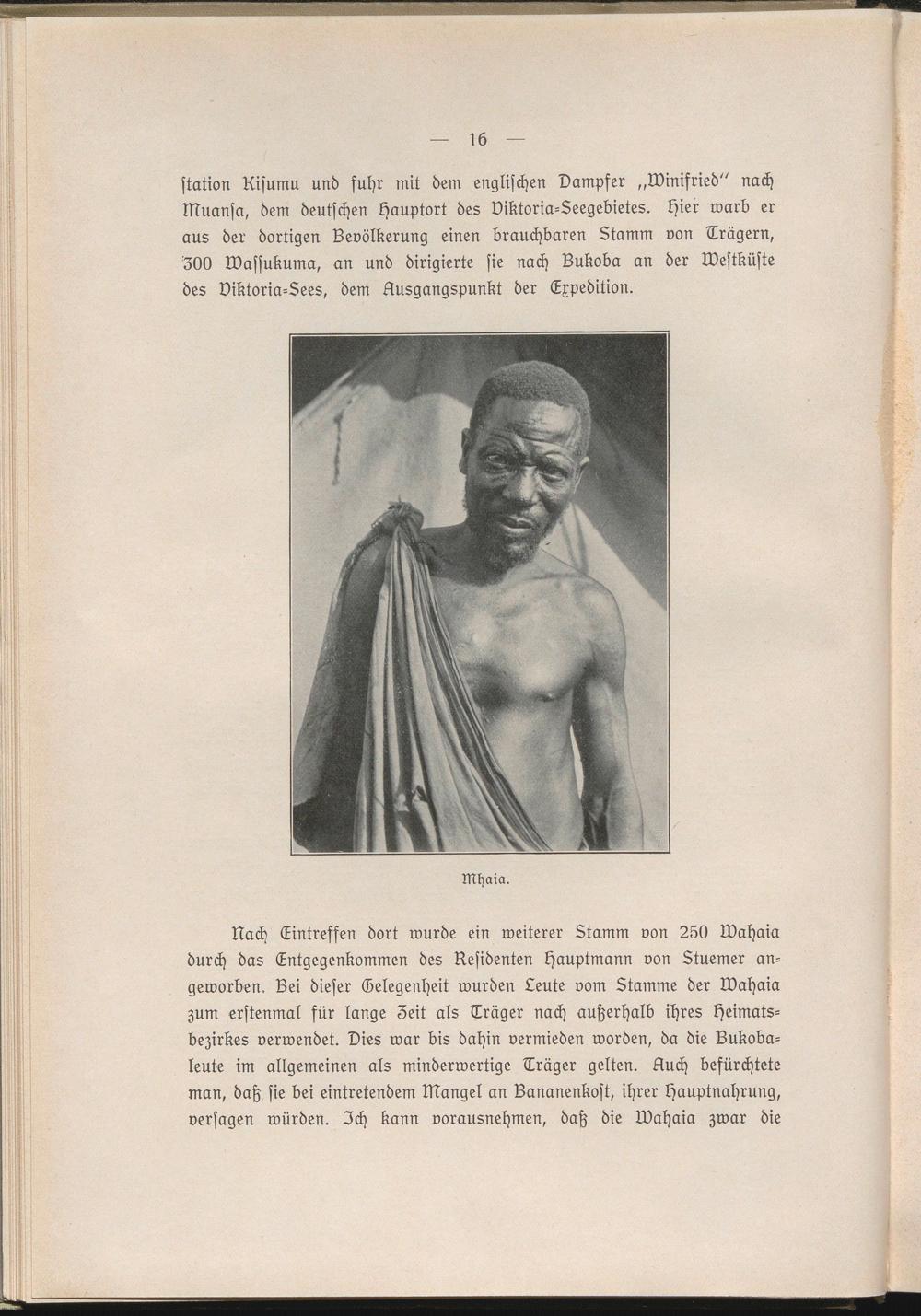 Nach Eintreffen dort wurde ein weiterer Stamm von 250 lvahaia durch das Entgegenkommen des Residenten Hauptmann von Stuemer angeworben. Lei dieser Gelegenheit wurden Leute vom Stamme der lvahaia zum erstenmal für lange Zeit als Träger nach außerhalb ihres Heimatsbezirkes verwendet. Dies war bis dahin vermieden worden, da die Bukoba- leute im allgemeinen als minderwertige Träger gelten. Auch befürchtete man, daß sie bei eintretendem Mangel an Lananenkost, ihrer Hauptnahrung, versagen würden. Ich kann vorausnehmen, daß die lvahaia zwar die