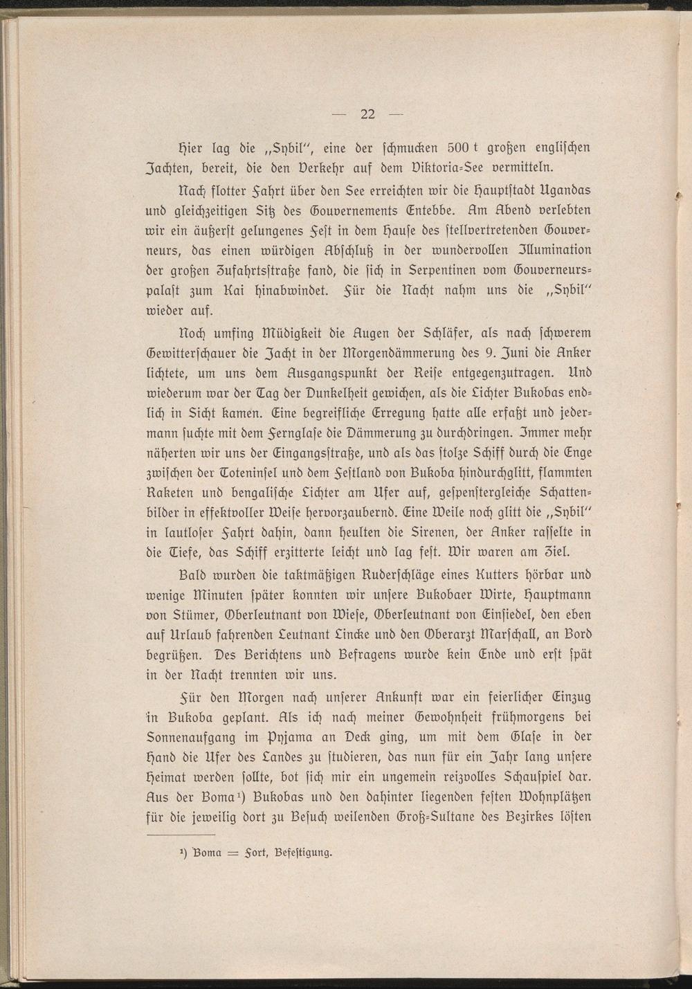 Bald wurden die taktmäßigen Nuderschläge eines Nutters hörbar und wenige Minuten später konnten wir unsere Bukobaer Wirte, Hauptmann von Stümer, Oberleutnant von Wiese, Oberleutnant von Linsiedel, den eben aus Urlaub fahrenden Leutnant Lincke und den Oberarzt Marschall, an Bord begrüßen. Des Berichten? und Besragens wurde kein Ende und erst spät in der Nacht trennten wir uns.