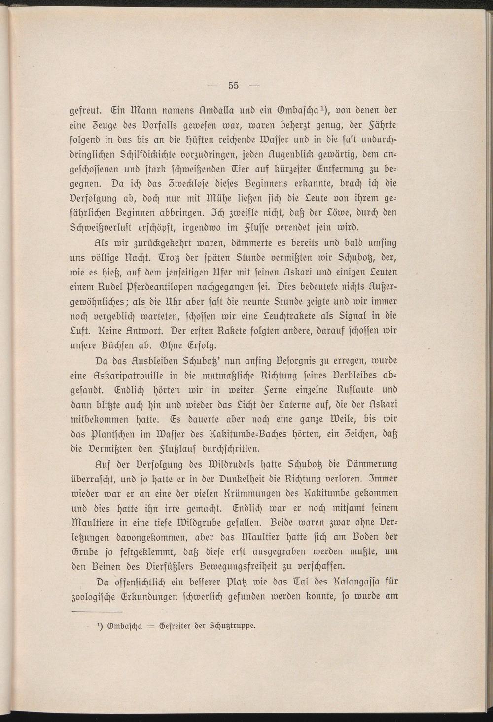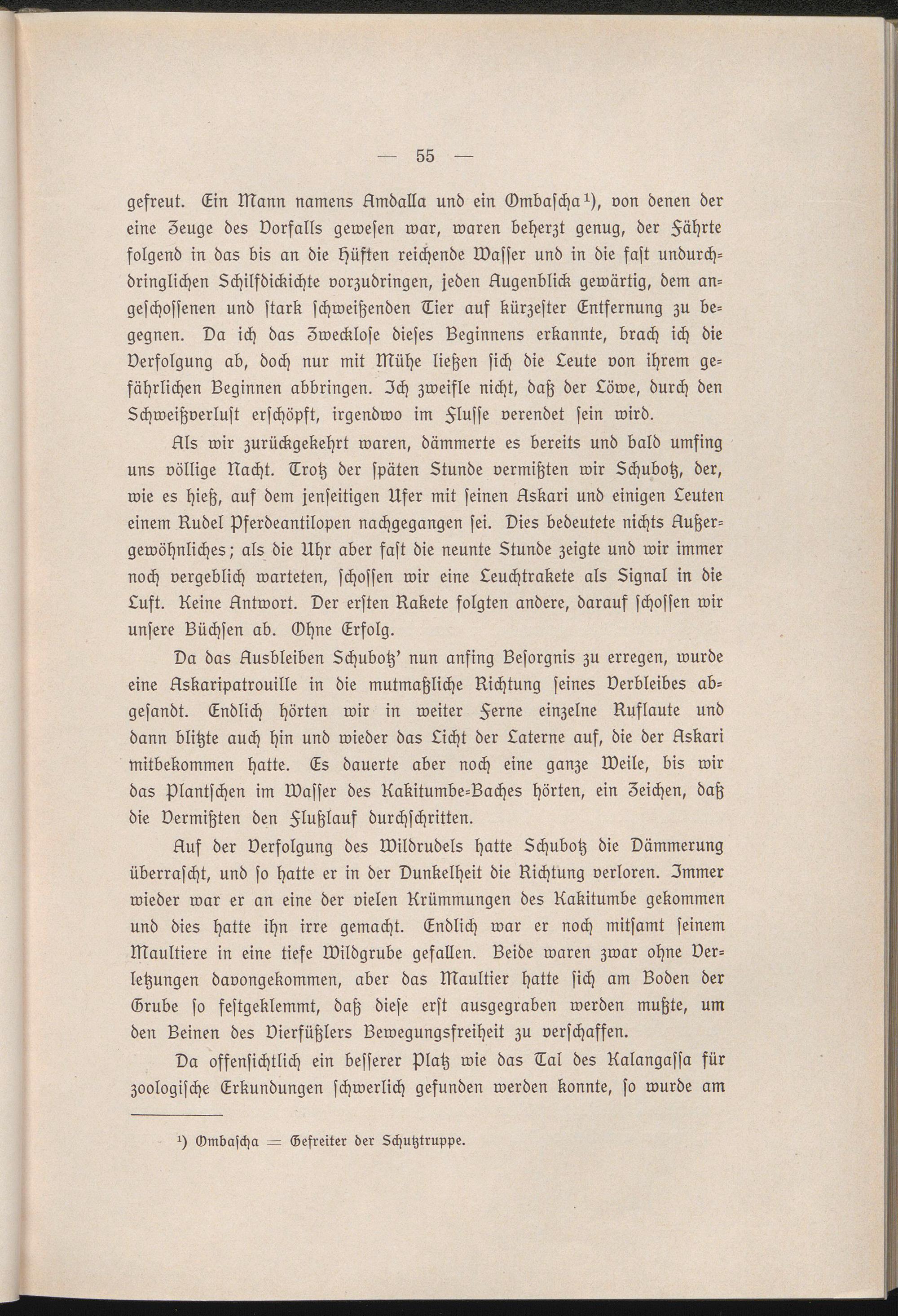 gefreut. Ein Mann namens Amdalla und ein Gmbaschap, von denen der eine Zeuge des Vorfalls gewesen war, waren beherzt genug, der Fährte folgend in das bis an die Hüften reichende Wasser und in die fast undurchdringlichen Schilfdickichte vorzudringen, jeden Augenblick gewärtig, dem angeschossenen und stark schweißenden Eier auf kürzester Entfernung zu begegnen. Da ich das Zwecklose dieses Beginnens erkannte, brach ich die Verfolgung ab, doch nur mit Mühe ließen sich die Leute von ihrem gefährlichen Beginnen abbringen. Ich zweifle nicht, daß der Löwe, durch den Schweißverlust erschöpft, irgendwo im Flusse verendet sein wird.