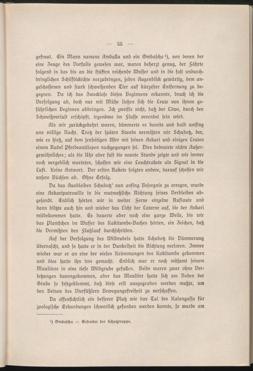 Als wir zurückgekehrt waren, dämmerte es bereits und bald umfing uns völlige Nacht. Trotz der späten Stunde vermißten wir Schubotz, der, wie es hieß, auf dem jenseitigen User mit seinen Askari und einigen Leuten einem Nudel Pserdeantilopen nachgegangen sei. Dies bedeutete nichts Außergewöhnliches ,' als die Uhr aber fast die neunte Stunde zeigte und wir immer noch vergeblich warteten, schössen wir eine Leuchtrakete als Signal in die Lust. Keine Antwort. Der ersten Nakete folgten andere, daraus schössen wir unsere Büchsen ab. Ohne Erfolg.