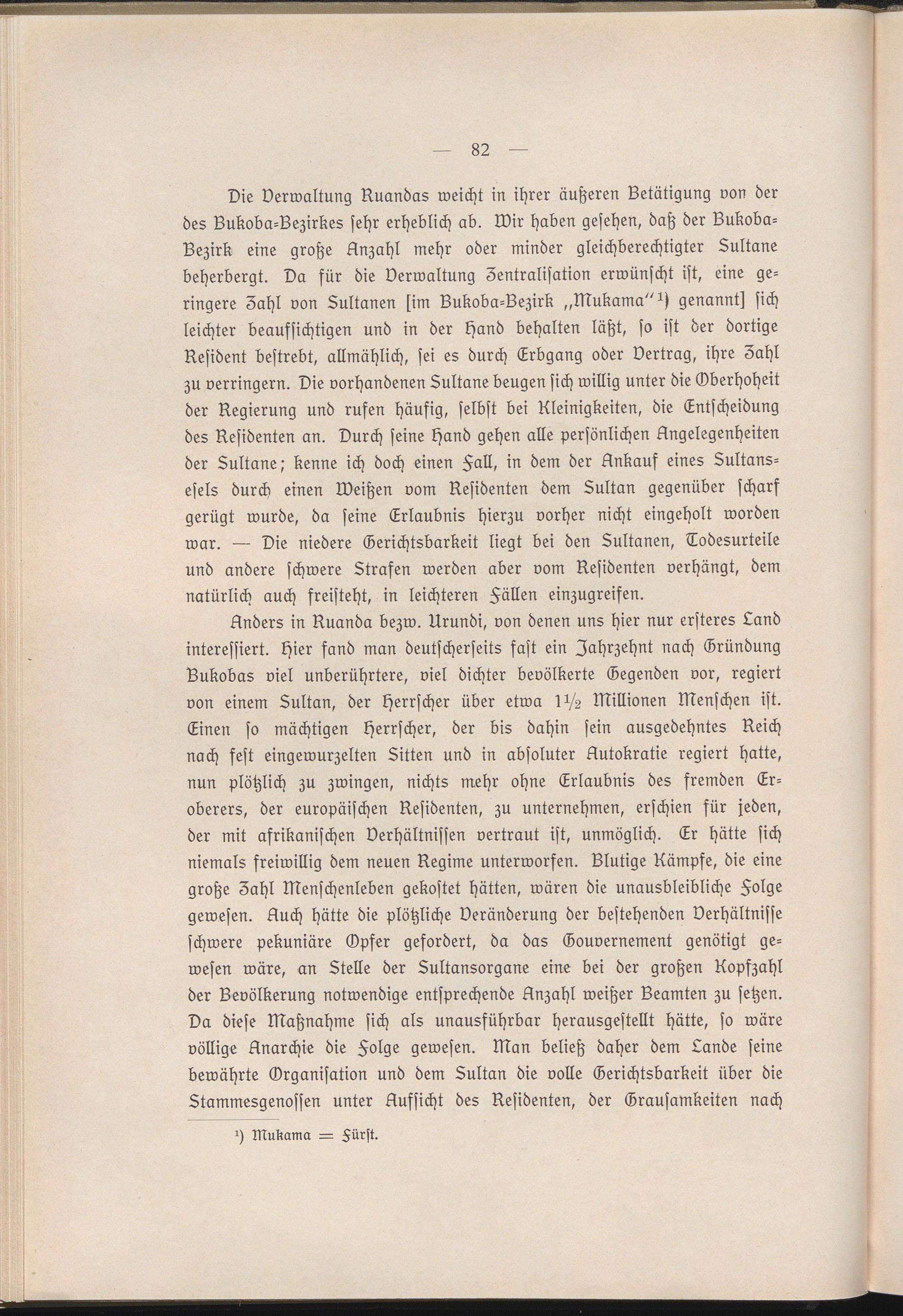 Anders in Ruanda bezw. Urundi, von denen uns hier nur ersteres Land interessiert. Hier fand man deutscherseits fast ein Jahrzehnt nach Gründung Bukobas viel unberührtere, viel dichter bevölkerte Gegenden vor, regiert von einem Sultan, der Herrscher über etwa Ichs Millionen Menschen ist. Einen so mächtigen Herrscher, der bis dahin sein ausgedehntes Reich nach fest eingewurzelten Sitten und in absoluter Autokratie regiert hatte, nun plötzlich zu zwingen, nichts mehr ohne Erlaubnis des fremden Eroberers, der europäischen Residenten, zu unternehmen, erschien für jeden, der mit afrikanischen Verhältnissen vertraut ist, unmöglich. Er hätte sich niemals freiwillig dem neuen Regime unterworfen. Blutige Kämpfe, die eine große Zahl Menschenleben gekostet hätten, wären die unausbleibliche Folge gewesen. Auch hätte die plötzliche Veränderung der bestehenden Verhältnisse schwere pekuniäre Opfer gefordert, da das Gouvernement genötigt gewesen wäre, an Stelle der Sultansorgane eine bei der großen Kopfzahl der Bevölkerung notwendige entsprechende Anzahl weißer Beamten zu setzen. Da diese Maßnahme sich als unausführbar herausgestellt hätte, so wäre völlige Anarchie die Folge gewesen. Man beließ daher dem Lande seine bewährte Organisation und dem Sultan die volle Gerichtsbarkeit über die Stammesgenossen unter Aufsicht des Residenten, der Grausamkeiten nach