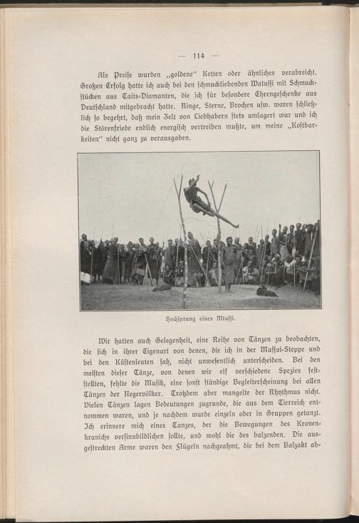 Mr hatten auch Gelegenheit, eine Reihe von Tänzen zu beobachten, die sich in ihrer Eigenart von denen, die ich in der Massai-Steppe und bei den Küstenleuten sah, nicht unwesentlich unterscheiden. Bei den meisten dieser Tänze, von denen wir elf verschiedene Spezies feststellten, fehlte die Musik, eine sonst ständige Begleiterscheinung bei allen Tänzen der Negervölker. Trotzdem aber mangelte der Rhythmus nicht, vielen Tänzen lagen Bedeutungen zugrunde, die aus dem Tierreich entnommen waren, und je nachdem wurde einzeln oder in Gruppen getanzt. Ich erinnere mich eines Tanzes, der die Bewegungen des Kronenkranichs versinnbildlichen sollte, und wohl die des balzenden. Die ausgestreckten Rrme waren den Flügeln nachgeahmt, die bei dem Balzakt ab-